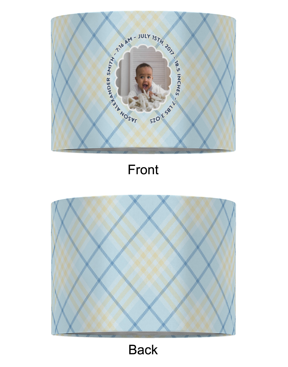 This design is for baby boys. The background is a baby blue plaid. In the middle of the design is a scalloped frame to upload your baby's picture into (make sure it is high quality!). Surrounding the frame is where your personalization goes. Put their name, birthday, or whatever you like.