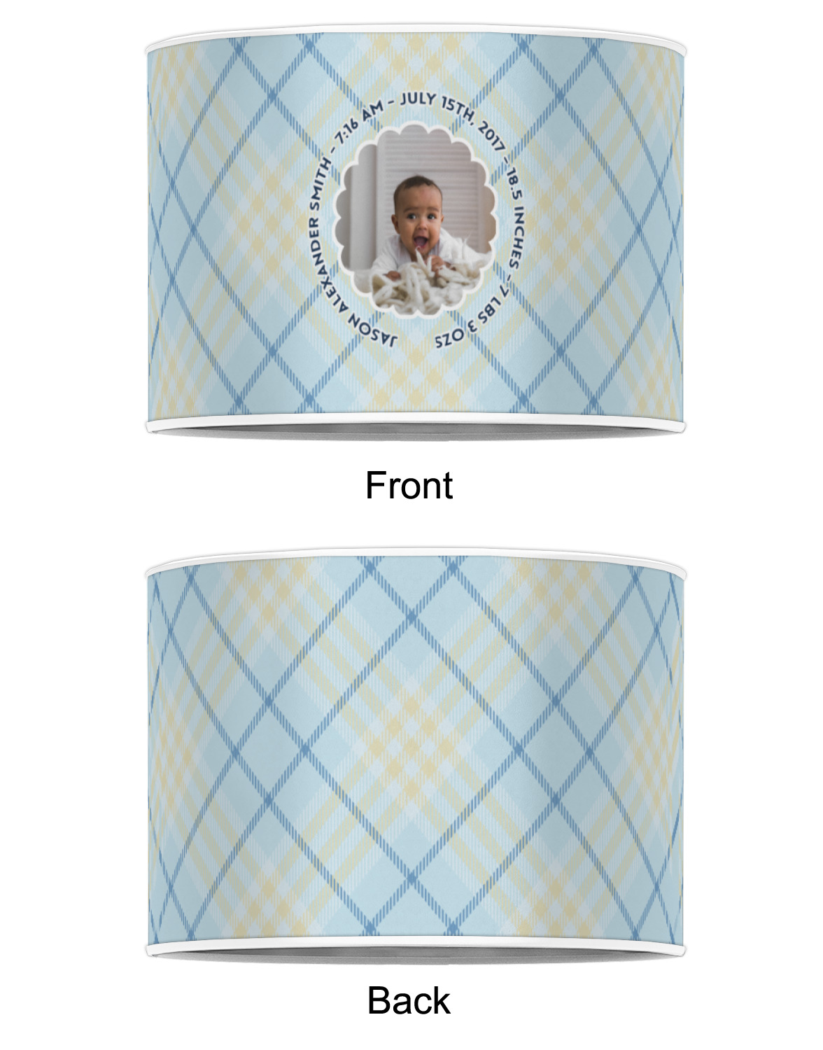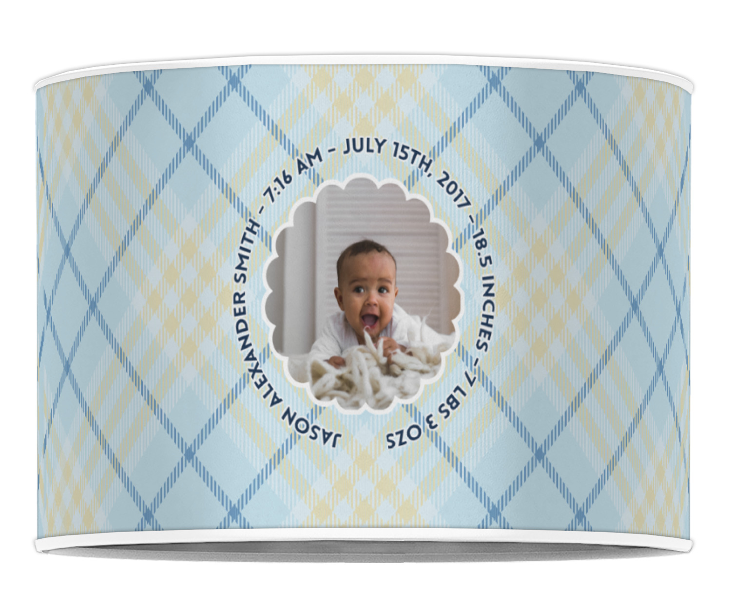 This design is for baby boys. The background is a baby blue plaid. In the middle of the design is a scalloped frame to upload your baby's picture into (make sure it is high quality!). Surrounding the frame is where your personalization goes. Put their name, birthday, or whatever you like.