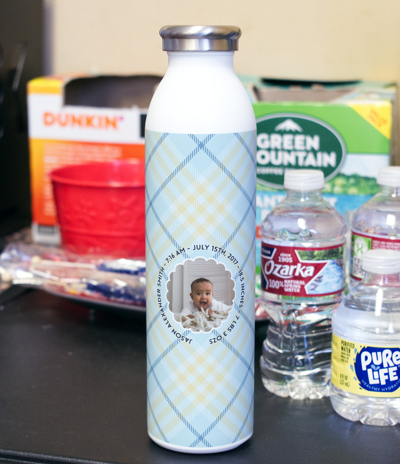 This design is for baby boys. The background is a baby blue plaid. In the middle of the design is a scalloped frame to upload your baby's picture into (make sure it is high quality!). Surrounding the frame is where your personalization goes. Put their name, birthday, or whatever you like.