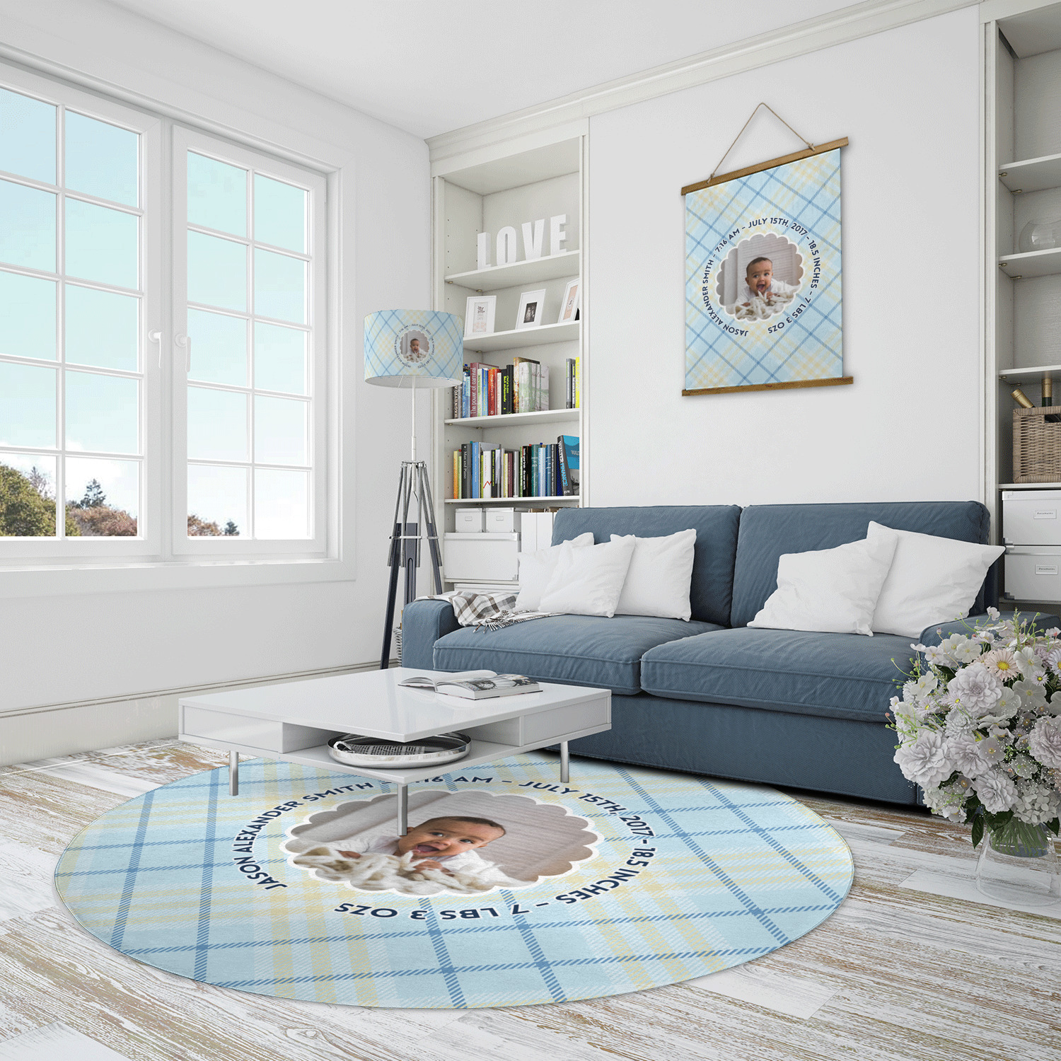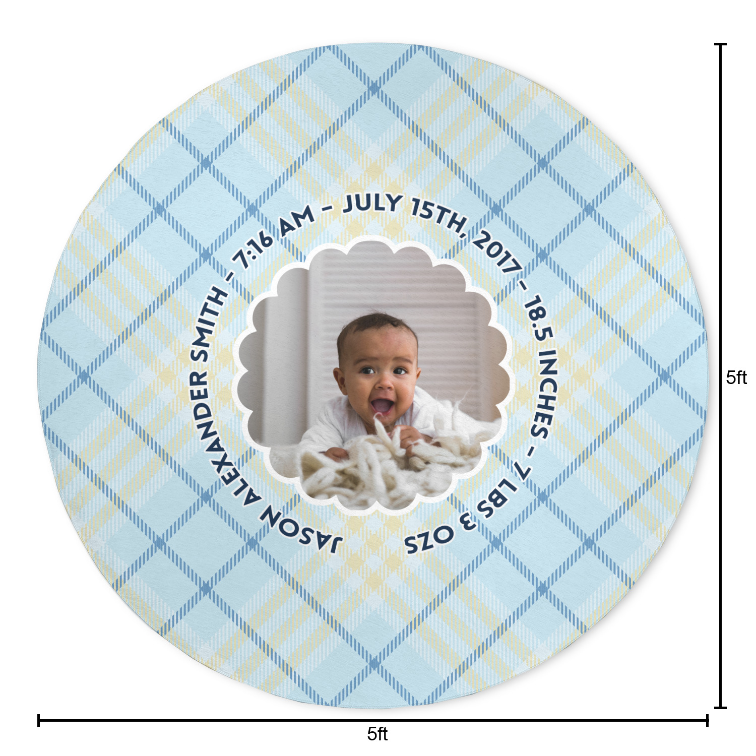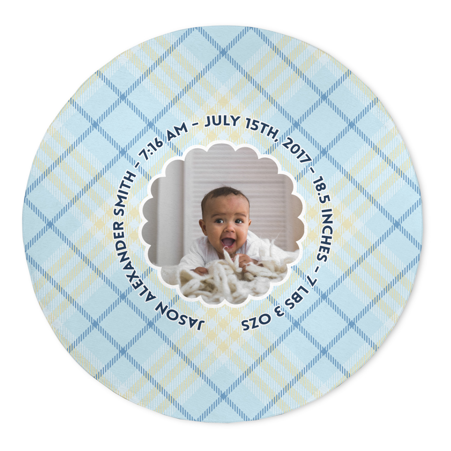 This design is for baby boys. The background is a baby blue plaid. In the middle of the design is a scalloped frame to upload your baby's picture into (make sure it is high quality!). Surrounding the frame is where your personalization goes. Put their name, birthday, or whatever you like.