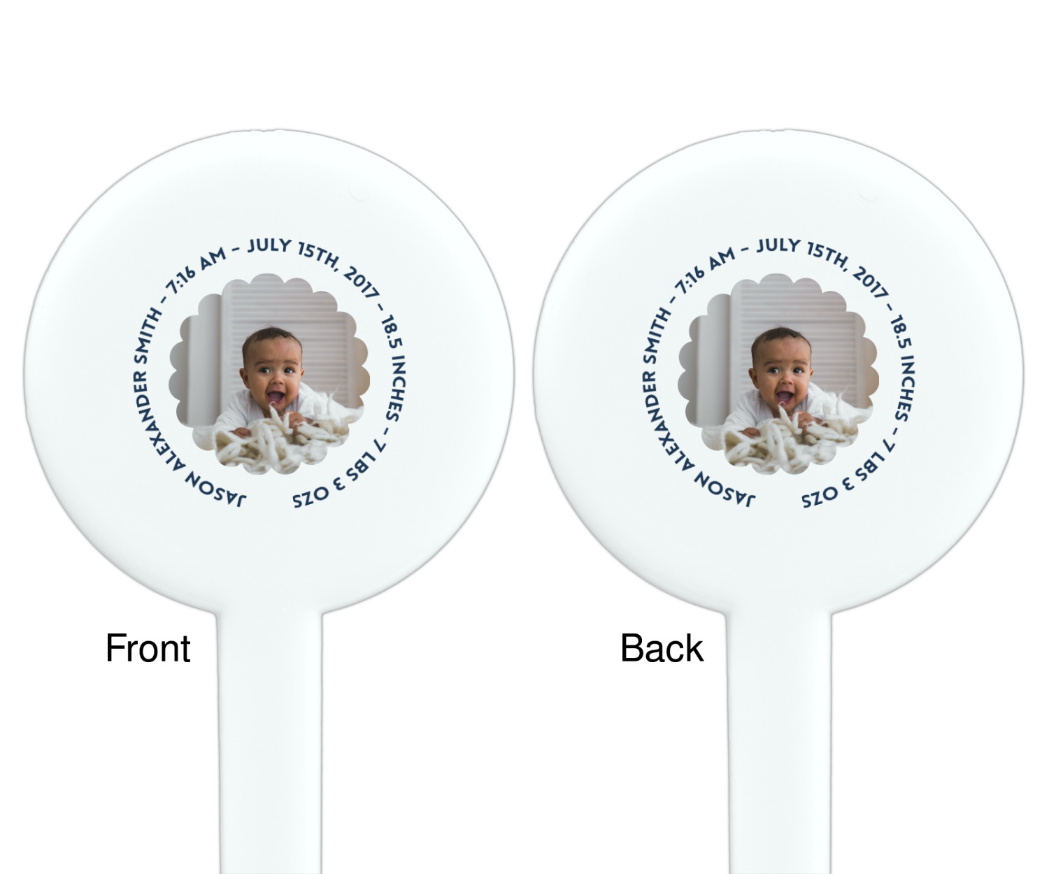 This design is for baby boys. The background is a baby blue plaid. In the middle of the design is a scalloped frame to upload your baby's picture into (make sure it is high quality!). Surrounding the frame is where your personalization goes. Put their name, birthday, or whatever you like.
