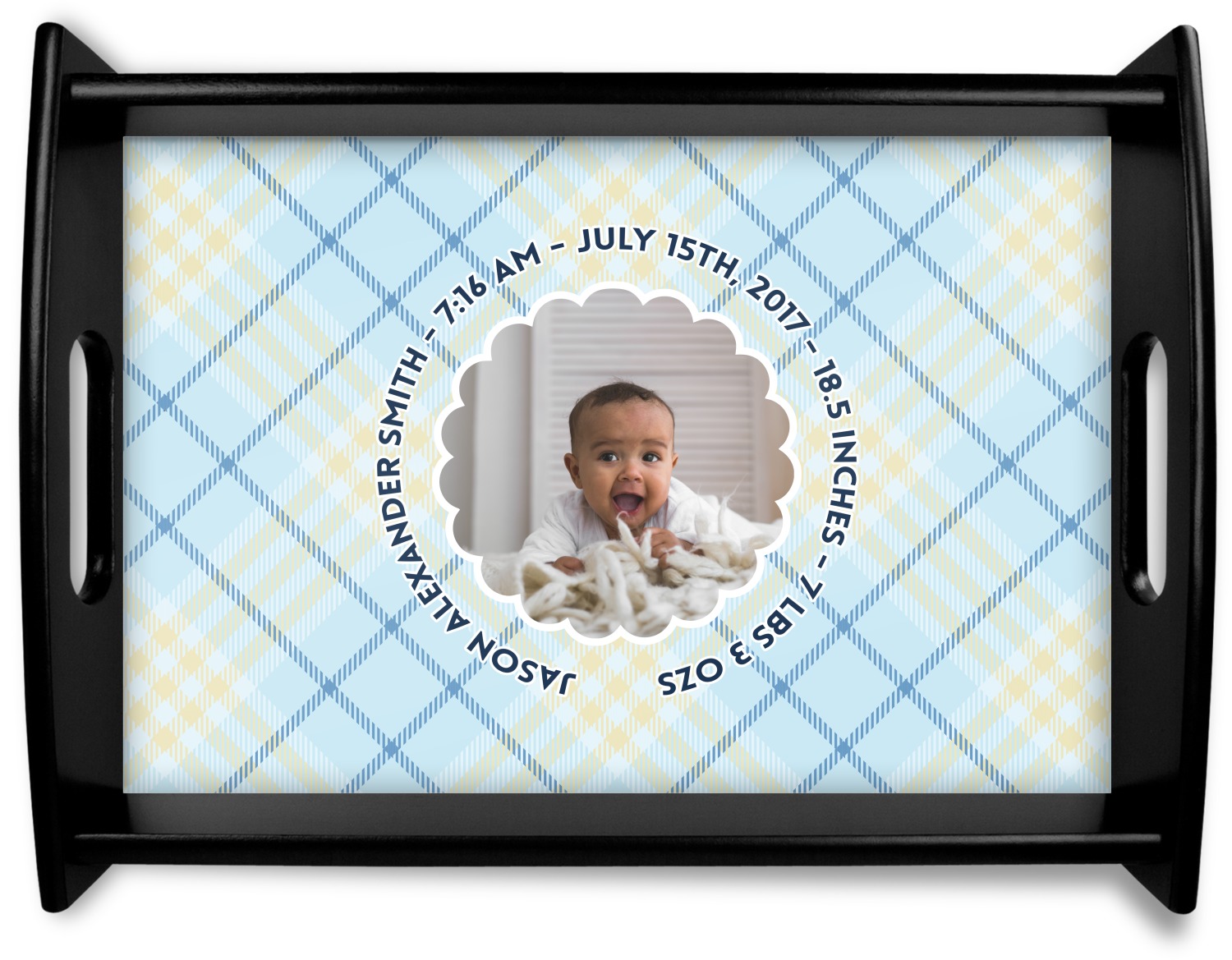 This design is for baby boys. The background is a baby blue plaid. In the middle of the design is a scalloped frame to upload your baby's picture into (make sure it is high quality!). Surrounding the frame is where your personalization goes. Put their name, birthday, or whatever you like.