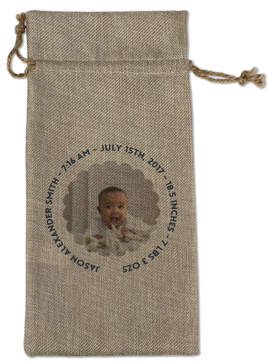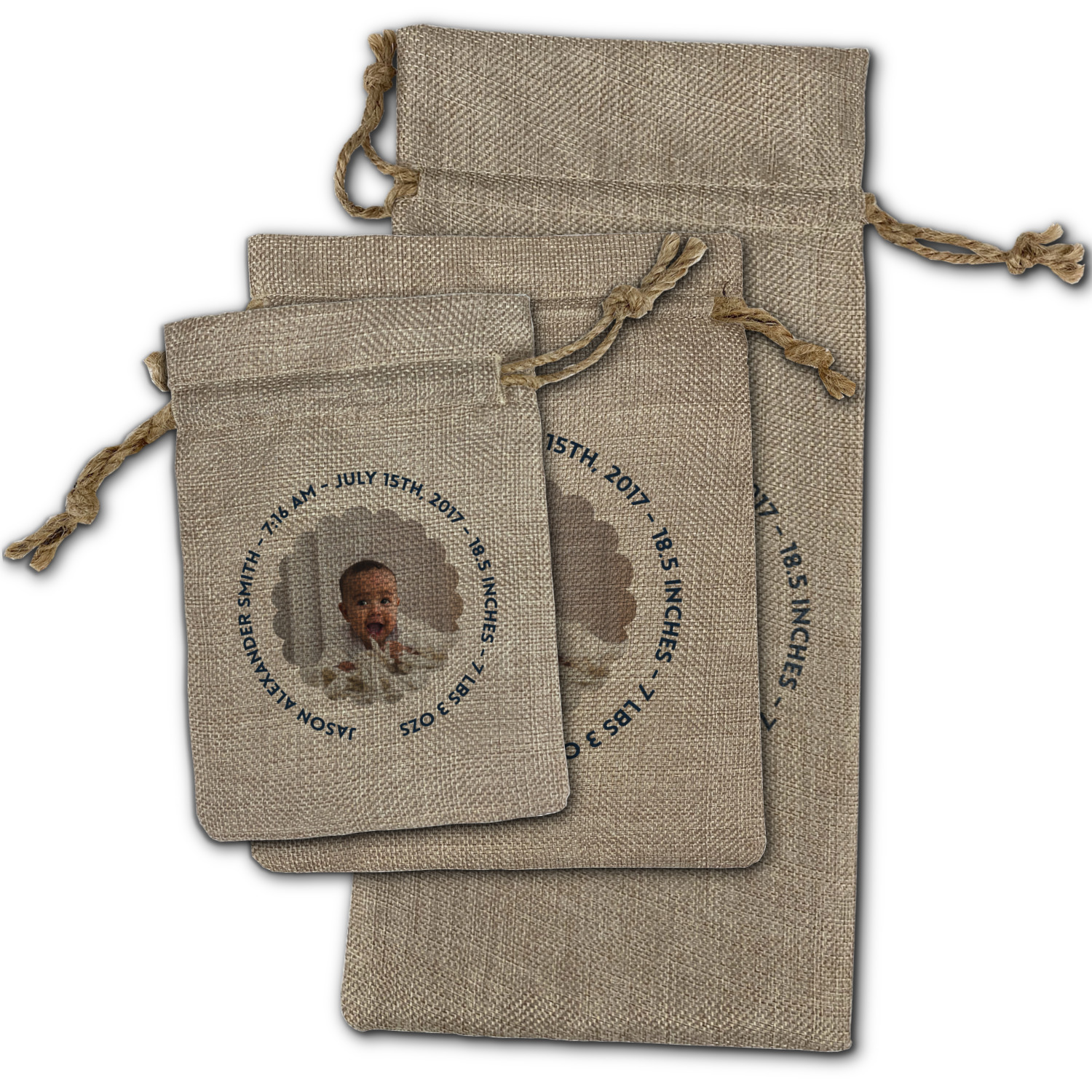 We sell our Burlap Gift Bags in 3 variant sized bags. Made with burlap polyester, each personalized bag can be secured with a twine drawstring pull. Your custom design is available to print on one side or both sides - completely up to you! The sizes of the bags measure approximately 4.5" x 6.5" for the smallest size, 6.5" x 8.0" for the medium size, and 6.5" x 13.5" for the large-sized bag.