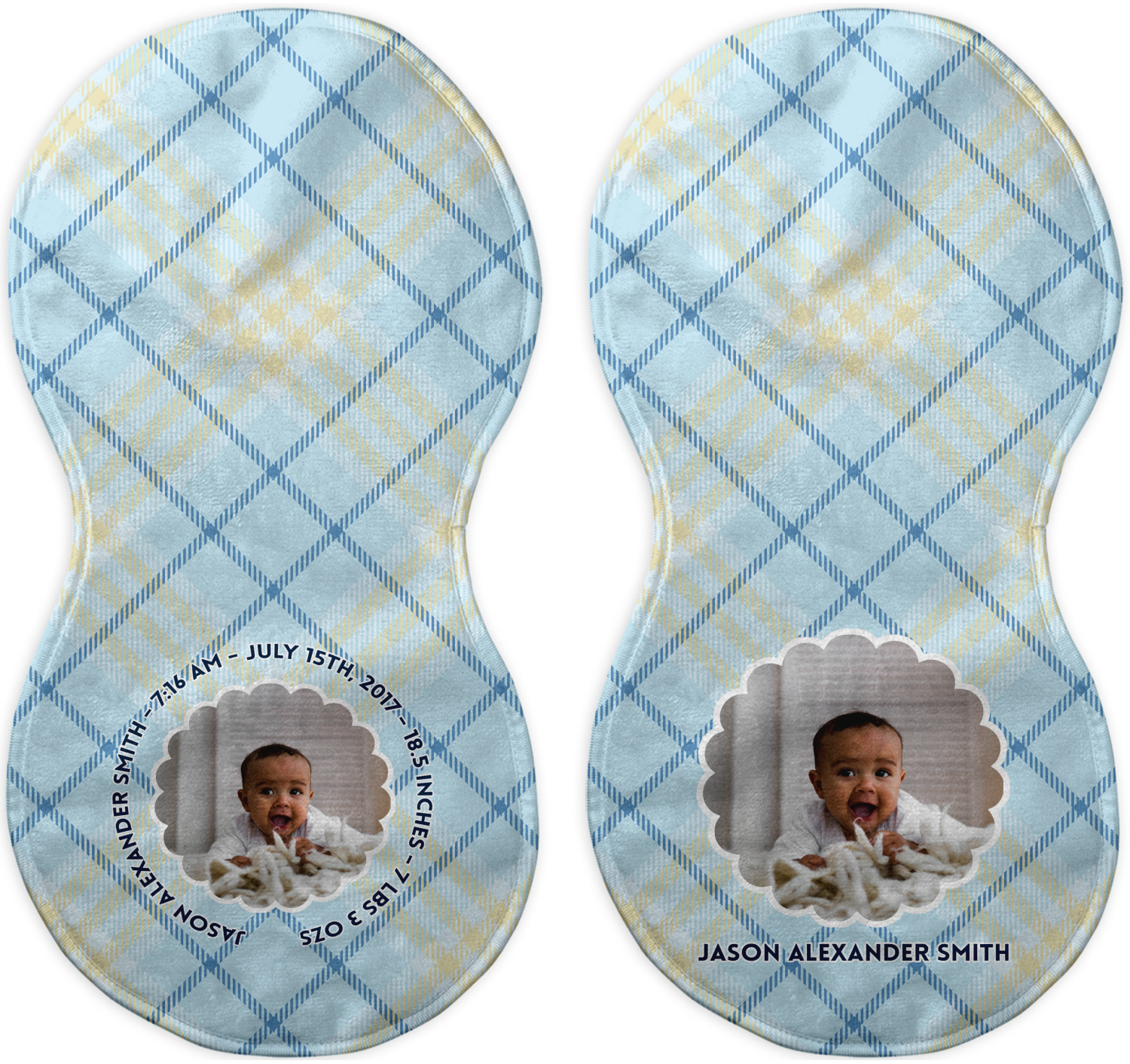 This design is for baby boys. The background is a baby blue plaid. In the middle of the design is a scalloped frame to upload your baby's picture into (make sure it is high quality!). Surrounding the frame is where your personalization goes. Put their name, birthday, or whatever you like.