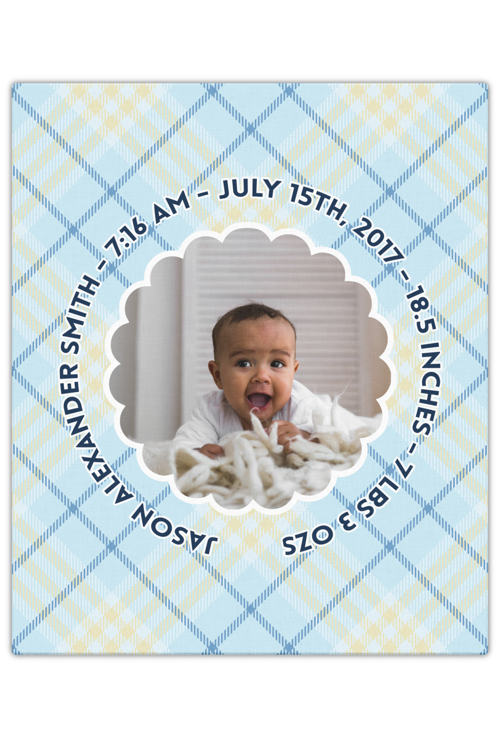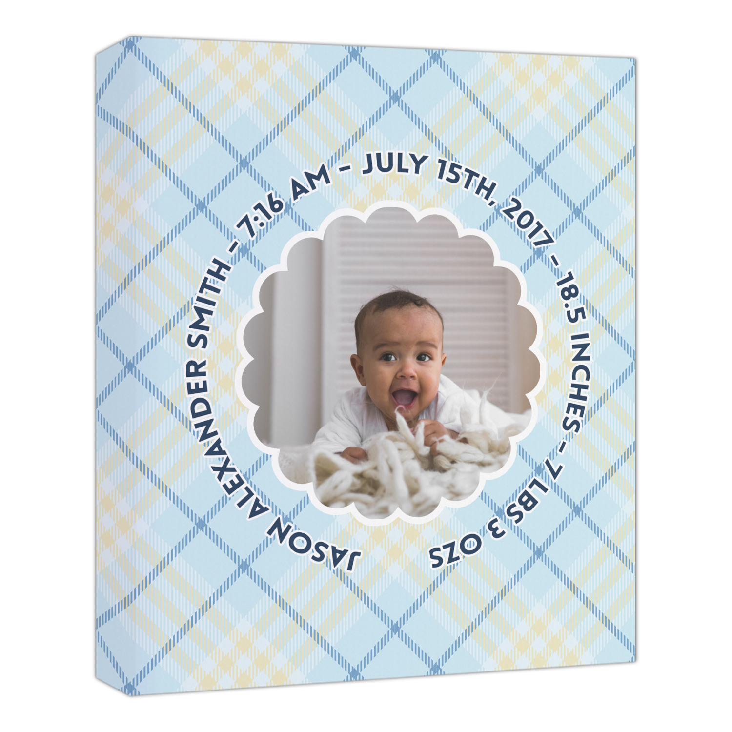 This design is for baby boys. The background is a baby blue plaid. In the middle of the design is a scalloped frame to upload your baby's picture into (make sure it is high quality!). Surrounding the frame is where your personalization goes. Put their name, birthday, or whatever you like.