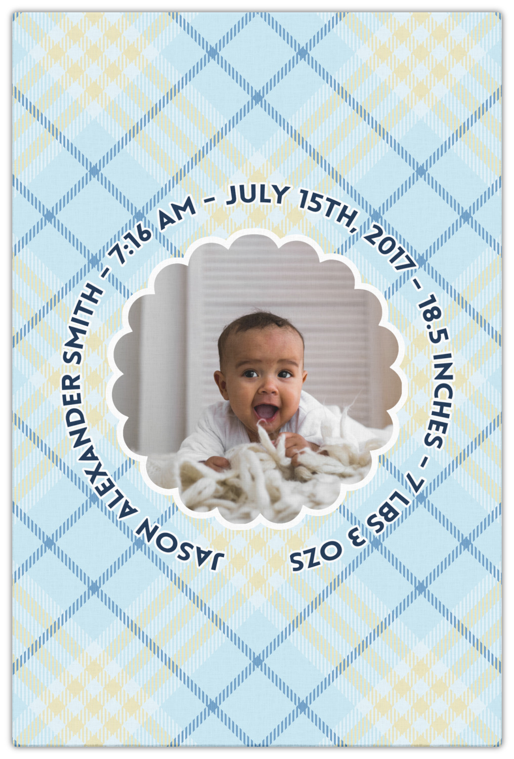 This design is for baby boys. The background is a baby blue plaid. In the middle of the design is a scalloped frame to upload your baby's picture into (make sure it is high quality!). Surrounding the frame is where your personalization goes. Put their name, birthday, or whatever you like.