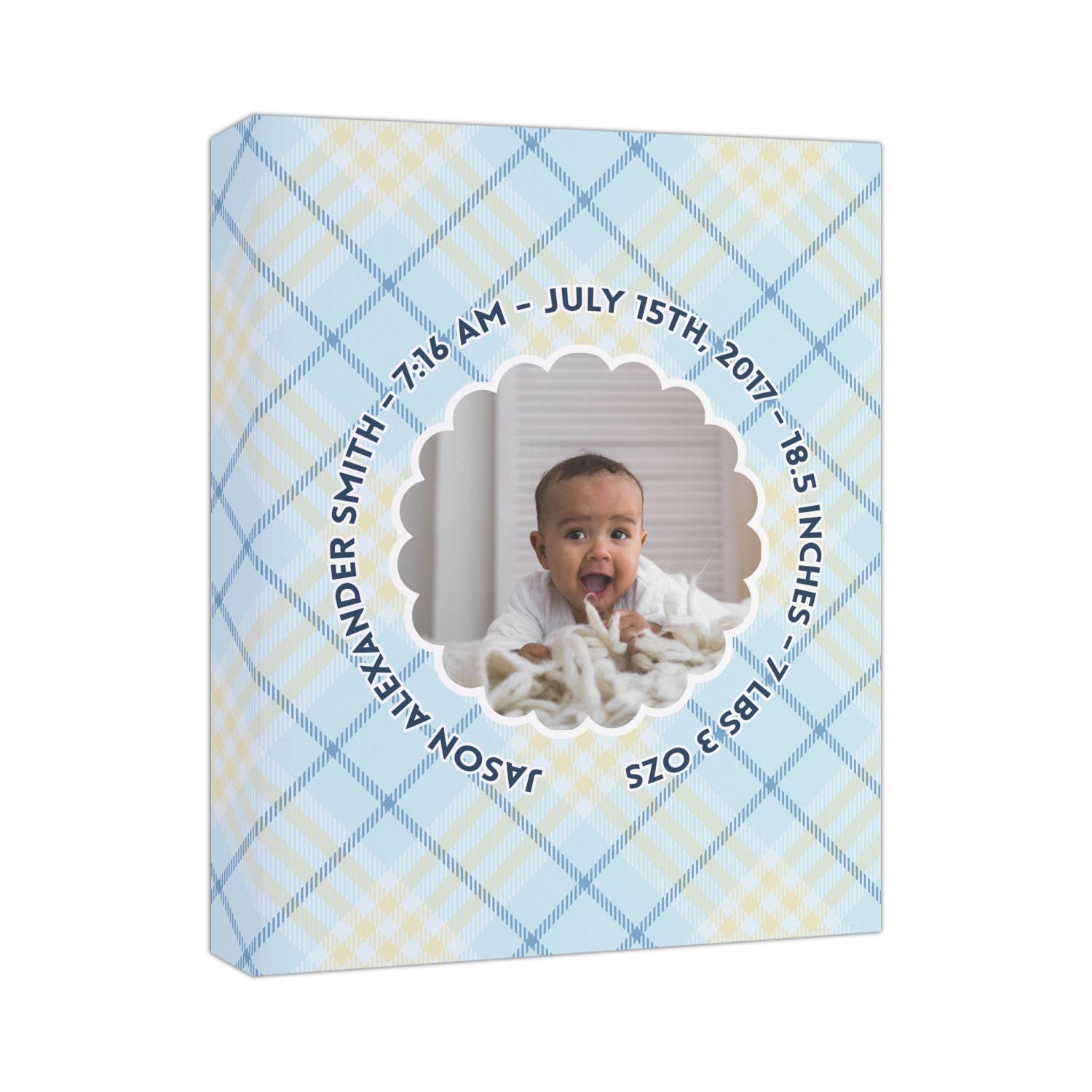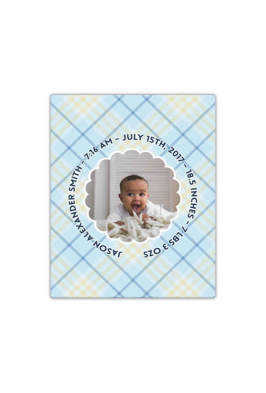 This design is for baby boys. The background is a baby blue plaid. In the middle of the design is a scalloped frame to upload your baby's picture into (make sure it is high quality!). Surrounding the frame is where your personalization goes. Put their name, birthday, or whatever you like.