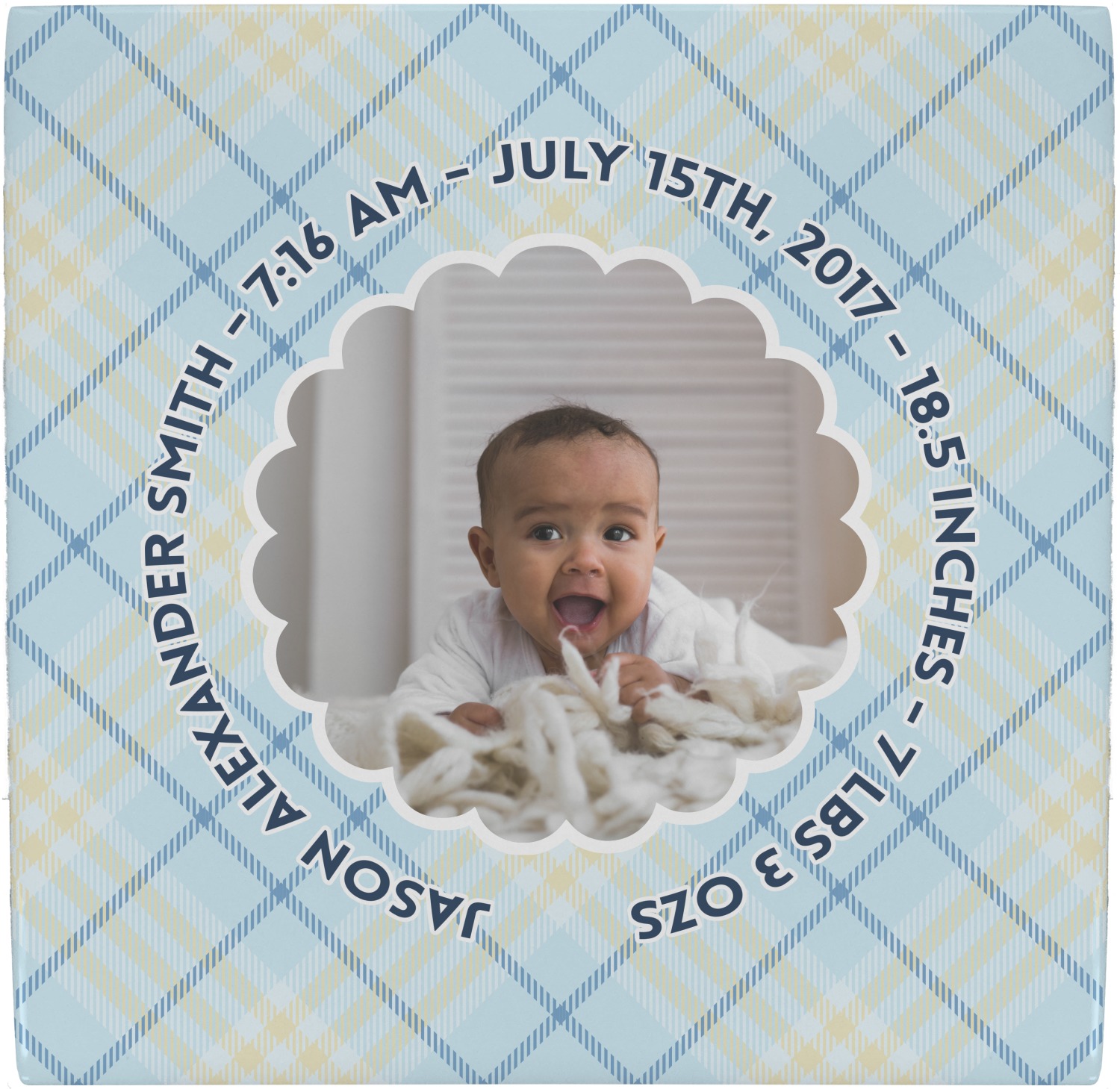 This design is for baby boys. The background is a baby blue plaid. In the middle of the design is a scalloped frame to upload your baby's picture into (make sure it is high quality!). Surrounding the frame is where your personalization goes. Put their name, birthday, or whatever you like.