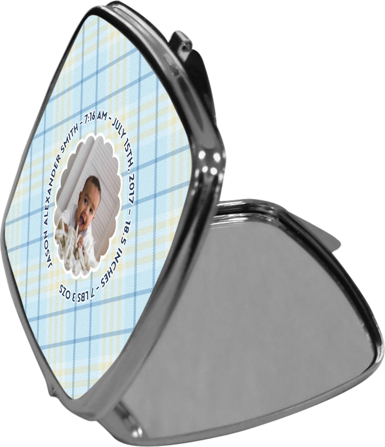 Our compact mirrors are customized with your design on one side. The other side is patterned silver tone metal. Inside, there are two mirrors.