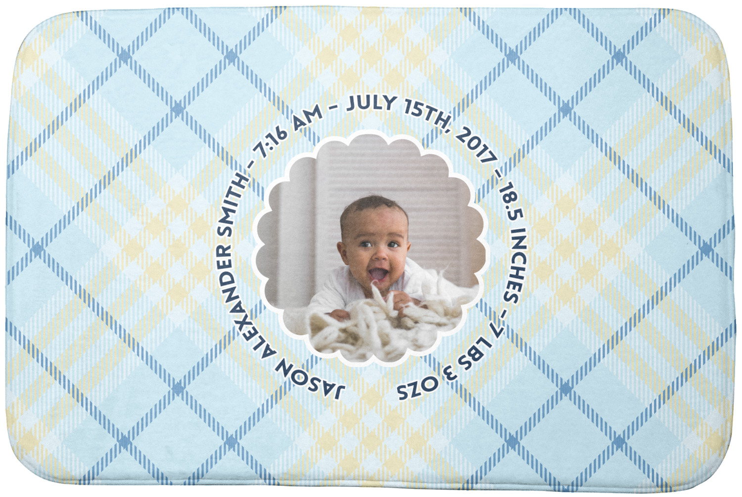 This design is for baby boys. The background is a baby blue plaid. In the middle of the design is a scalloped frame to upload your baby's picture into (make sure it is high quality!). Surrounding the frame is where your personalization goes. Put their name, birthday, or whatever you like.