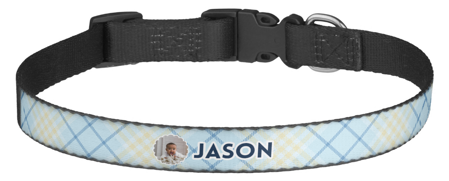 This sturdy collar, made from a durable nylon weave, will outlive your dog's episodes of excited tugging and pulling. Courtesy of its thick plastic buckle and adjuster, this collar is adjustable and accommodating of any dog. Structurally, the collar is a single piece of nylon weave that is sewn together, and features a solid metal loop where you can attach a leash or dog tag. We print and display your dog's name and pattern across the middle of the personalized dog collar.