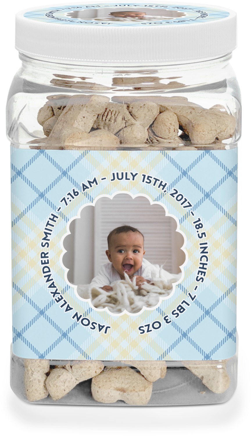 This half gallon jar, made from a sturdy plastic, is the perfect way to keep treats from any naughty pet paws, while still keeping them ready on hand for when your pup performs an impressive trick. This dog cookie jar features a screw-on, white lid that displays your personalized design on a vinyl sticker. We apply another customized sticker that wraps around the front and sides of the jar. Our dog treat jar also has indentations on the rear ends of the sides, which allows for convenient handling, and its square frame allows for easy storage.