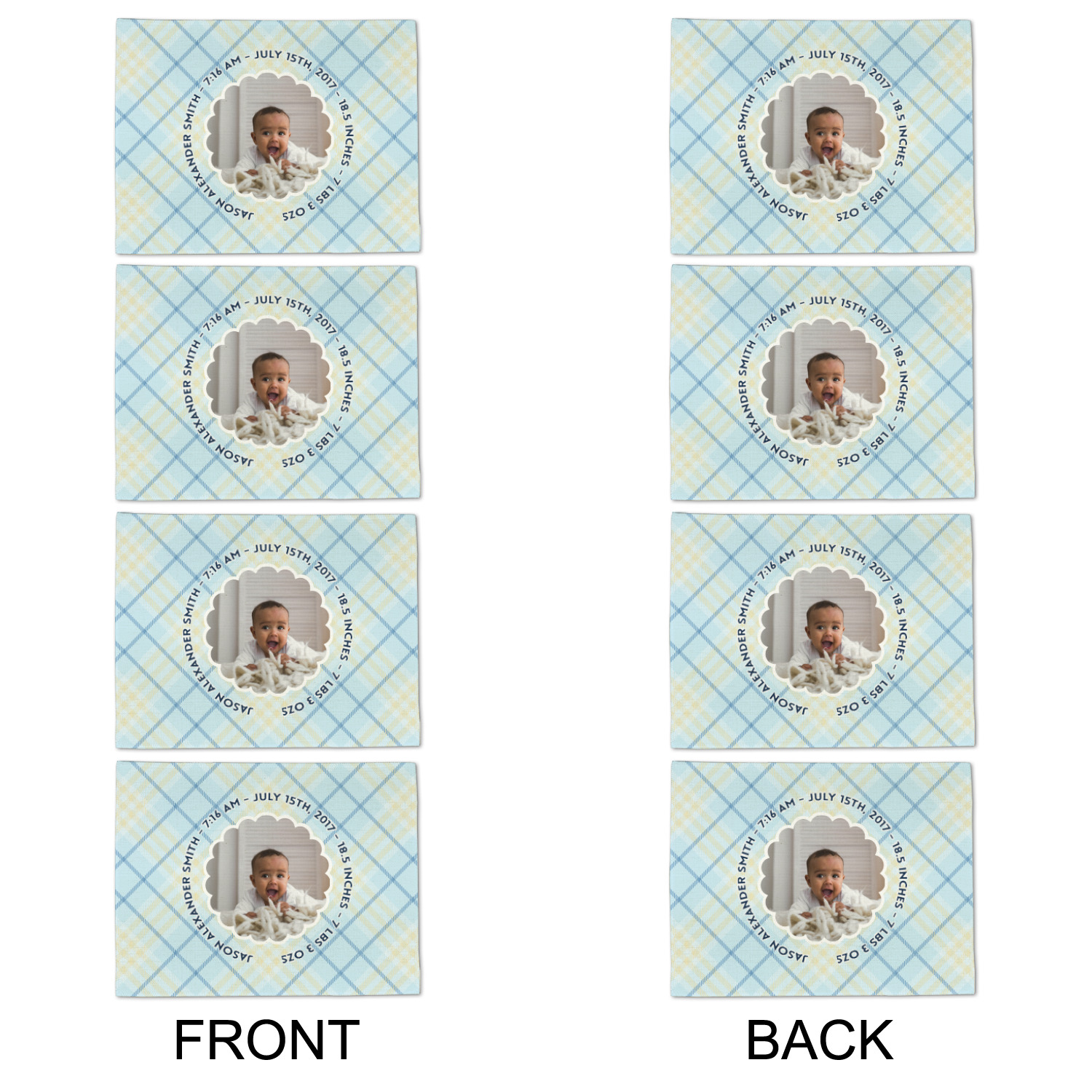 This design is for baby boys. The background is a baby blue plaid. In the middle of the design is a scalloped frame to upload your baby's picture into (make sure it is high quality!). Surrounding the frame is where your personalization goes. Put their name, birthday, or whatever you like.
