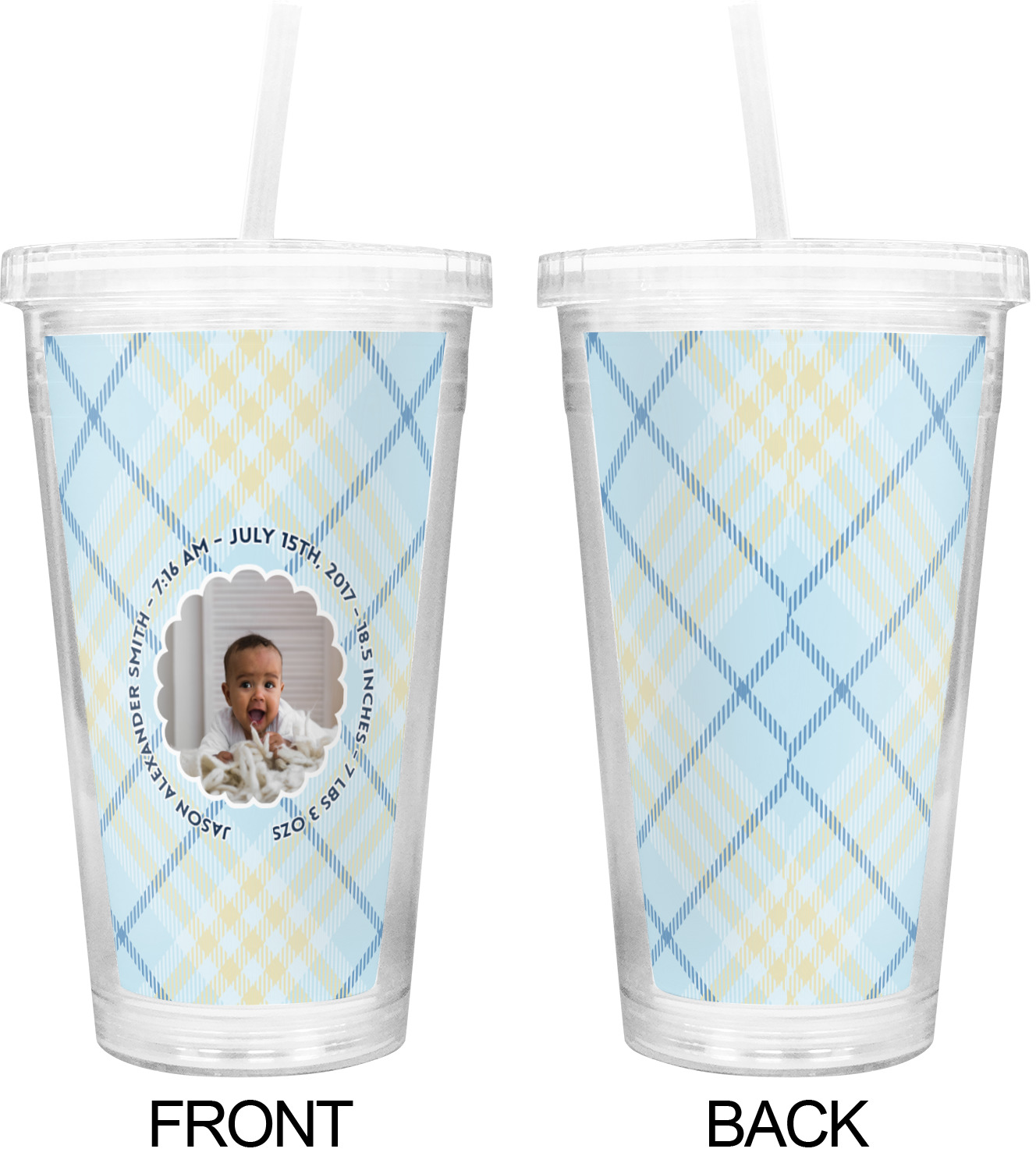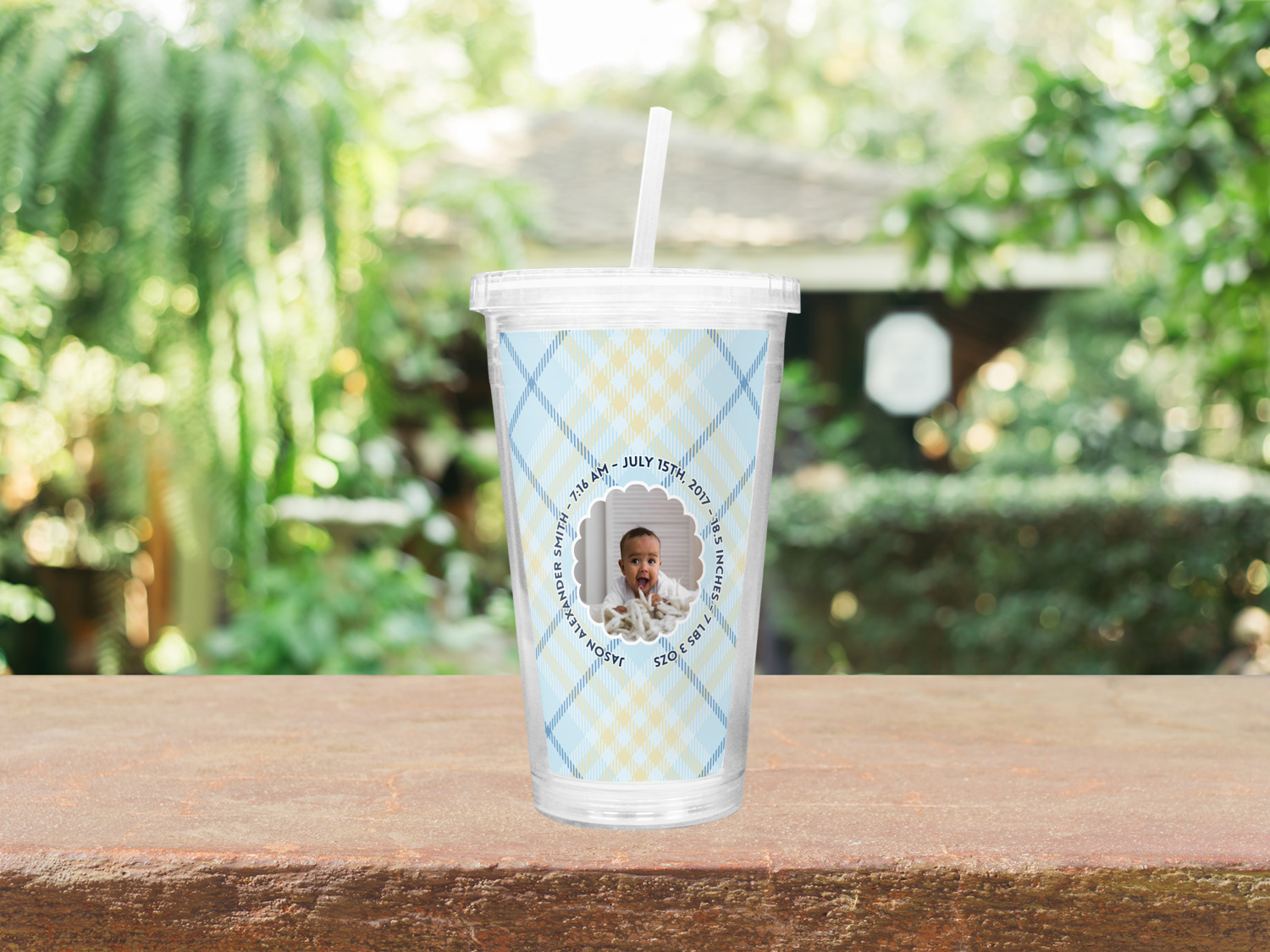 This design is for baby boys. The background is a baby blue plaid. In the middle of the design is a scalloped frame to upload your baby's picture into (make sure it is high quality!). Surrounding the frame is where your personalization goes. Put their name, birthday, or whatever you like.