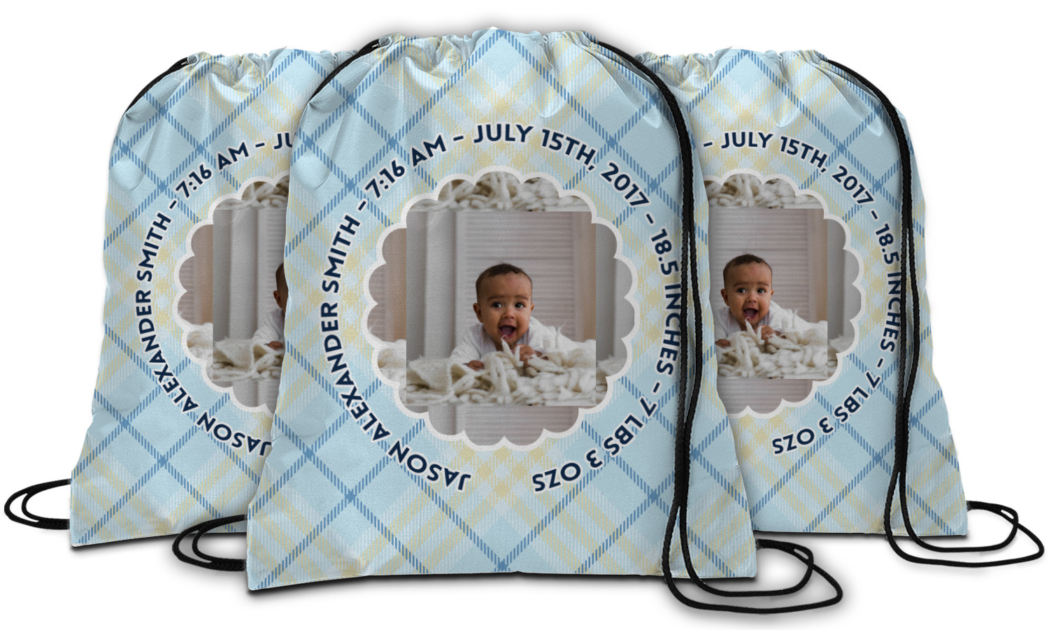 This design is for baby boys. The background is a baby blue plaid. In the middle of the design is a scalloped frame to upload your baby's picture into (make sure it is high quality!). Surrounding the frame is where your personalization goes. Put their name, birthday, or whatever you like.