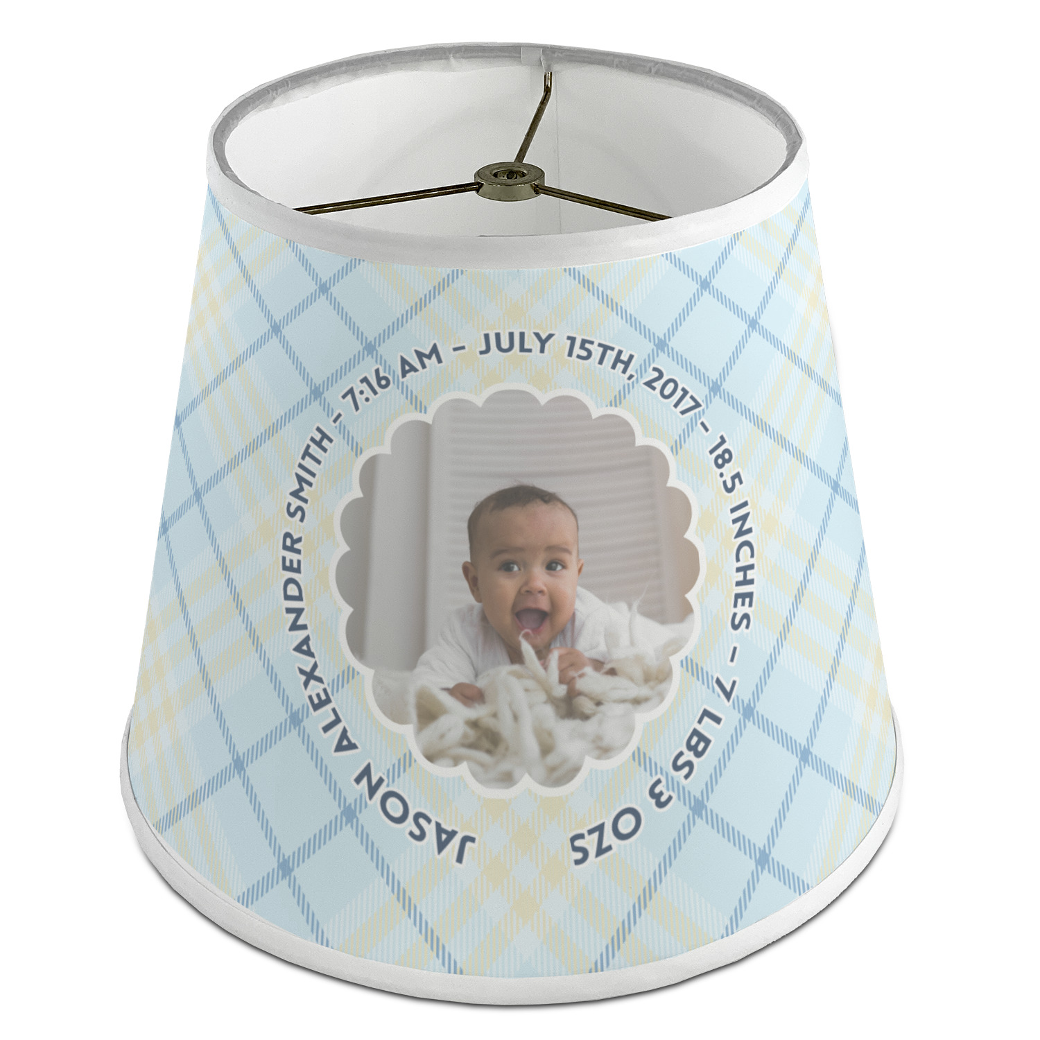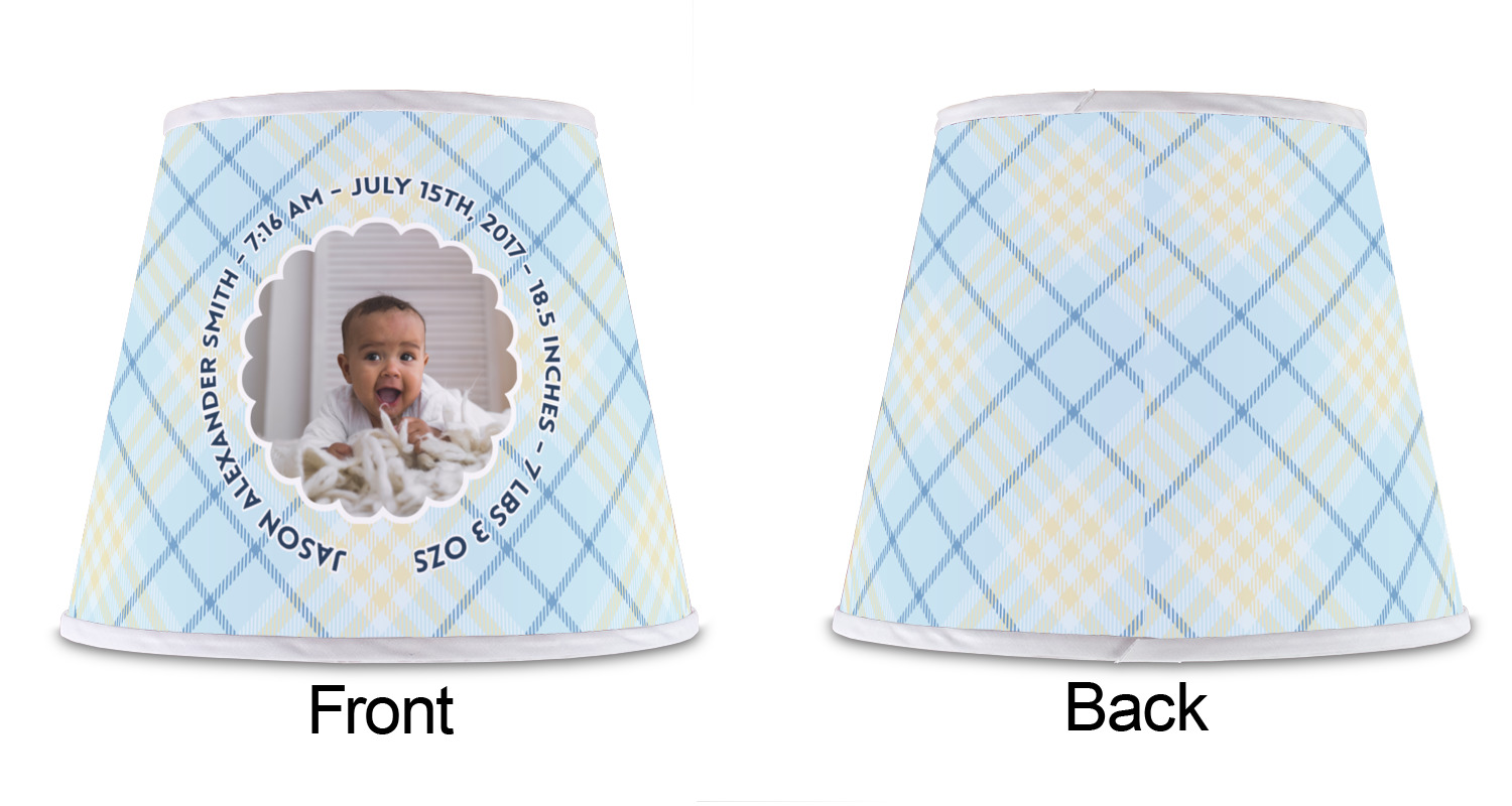 This design is for baby boys. The background is a baby blue plaid. In the middle of the design is a scalloped frame to upload your baby's picture into (make sure it is high quality!). Surrounding the frame is where your personalization goes. Put their name, birthday, or whatever you like.