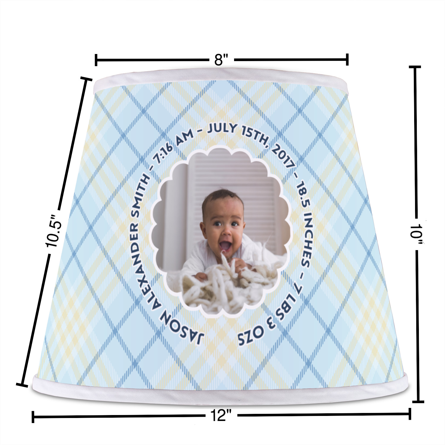 The base of this lampshade is 12 inches in diameter, and the top spans 8 inches in diameter. The total height of the lampshade is 10 inches. The angled nature of this custom lampshade concentrates the light, making it ideal for smaller spaces. This lampshade is made of matte, polyfilm, and displays your customization in its middle. The top and bottom of this colorful lamp shade are lined with a white fabric ribbon (which can be replaced with black inside the design studio) which frames your design and creates a sophisticated finish. As an UNO fitter lampshade, this unique lamp shade will fit a variety of bases.