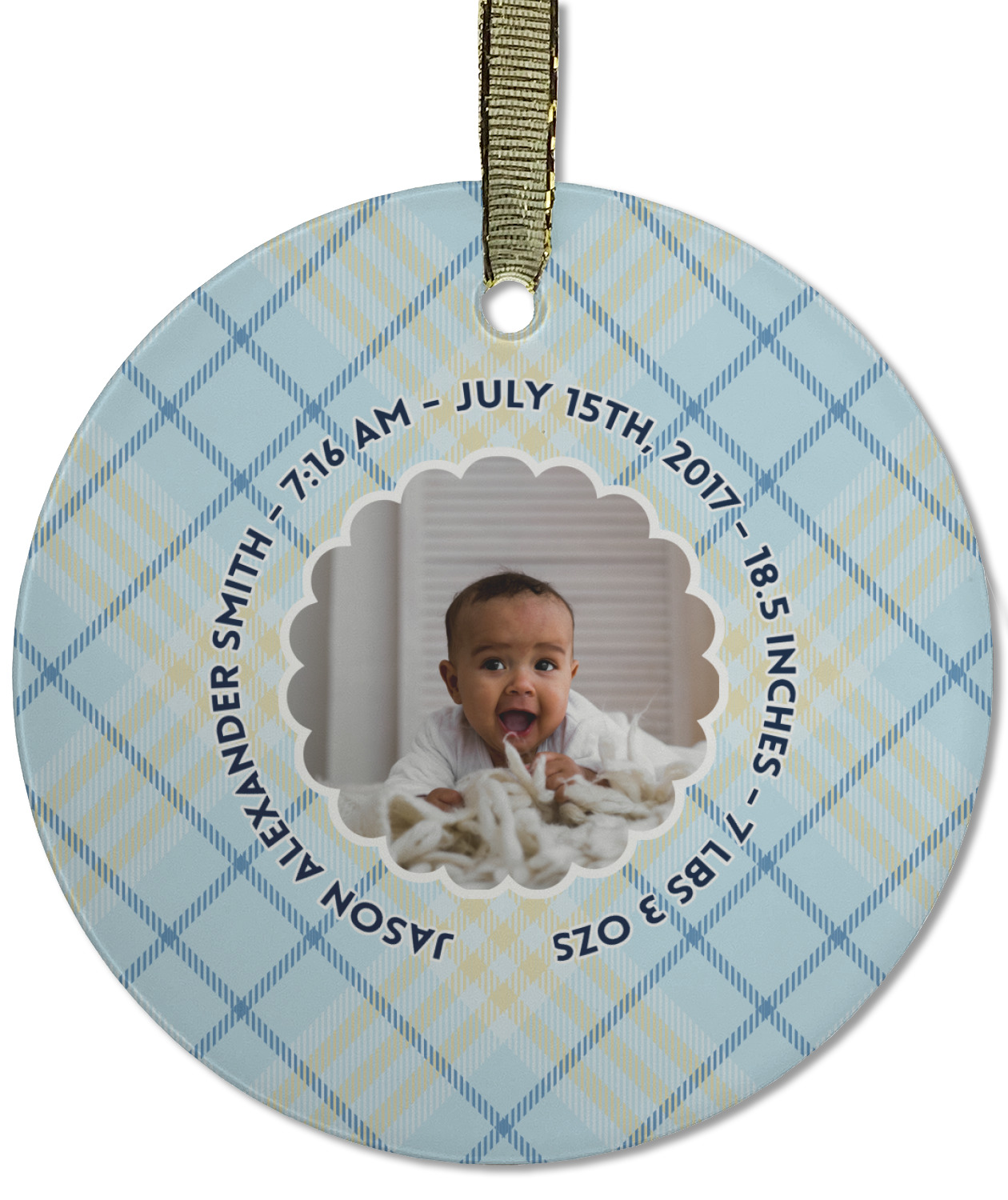 This design is for baby boys. The background is a baby blue plaid. In the middle of the design is a scalloped frame to upload your baby's picture into (make sure it is high quality!). Surrounding the frame is where your personalization goes. Put their name, birthday, or whatever you like.