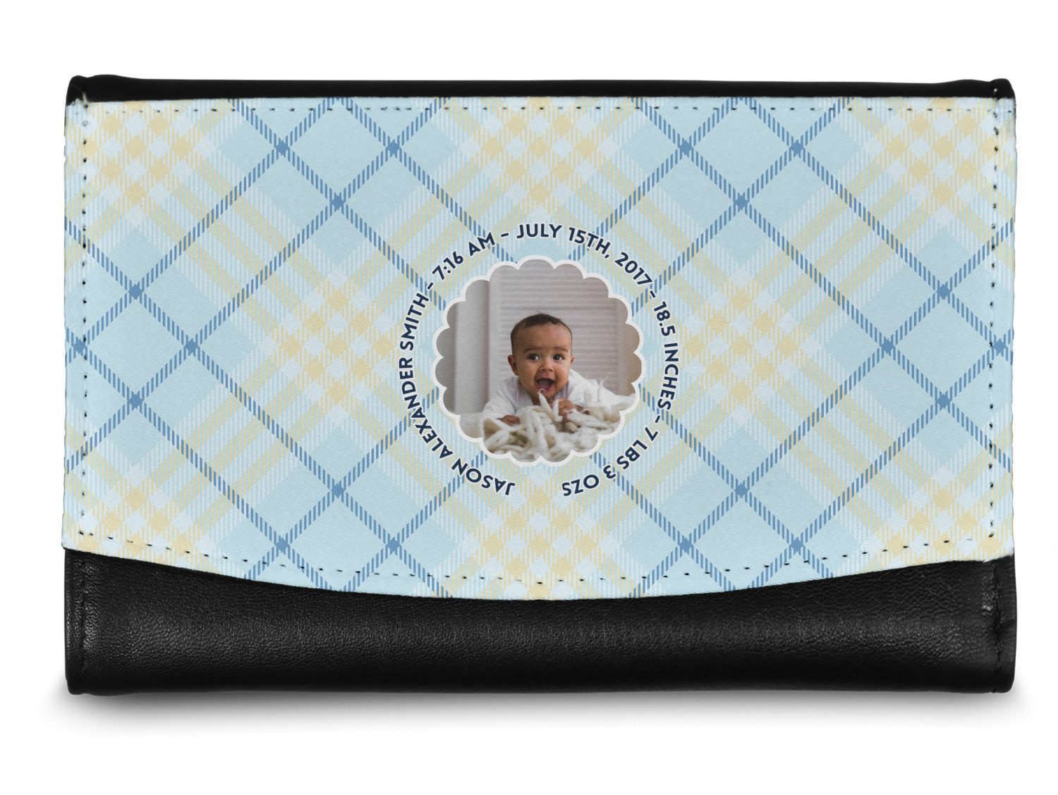 This design is for baby boys. The background is a baby blue plaid. In the middle of the design is a scalloped frame to upload your baby's picture into (make sure it is high quality!). Surrounding the frame is where your personalization goes. Put their name, birthday, or whatever you like.