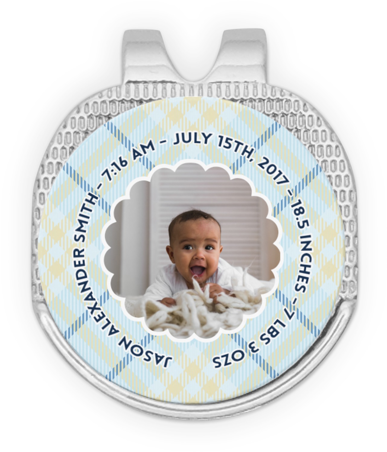 This design is for baby boys. The background is a baby blue plaid. In the middle of the design is a scalloped frame to upload your baby's picture into (make sure it is high quality!). Surrounding the frame is where your personalization goes. Put their name, birthday, or whatever you like.