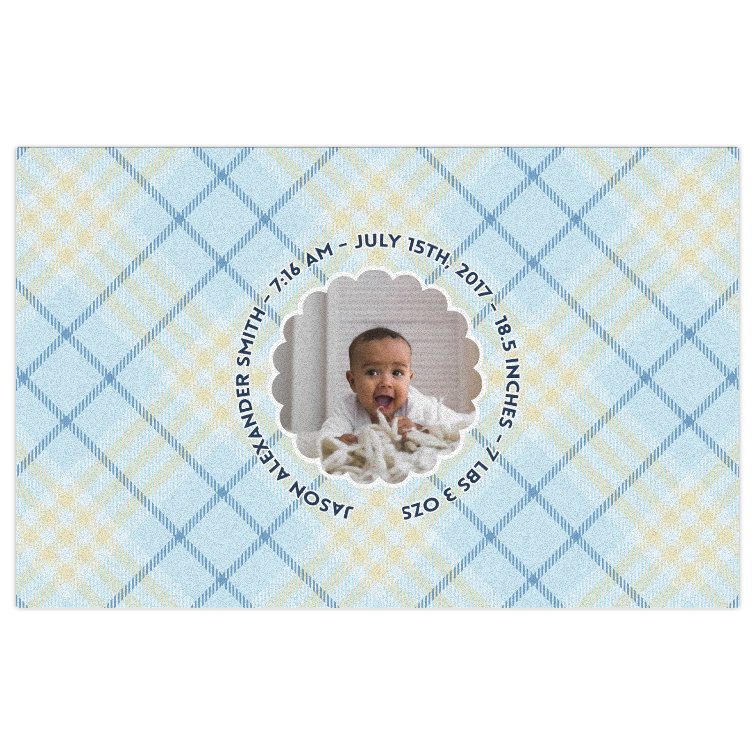 This design is for baby boys. The background is a baby blue plaid. In the middle of the design is a scalloped frame to upload your baby's picture into (make sure it is high quality!). Surrounding the frame is where your personalization goes. Put their name, birthday, or whatever you like.