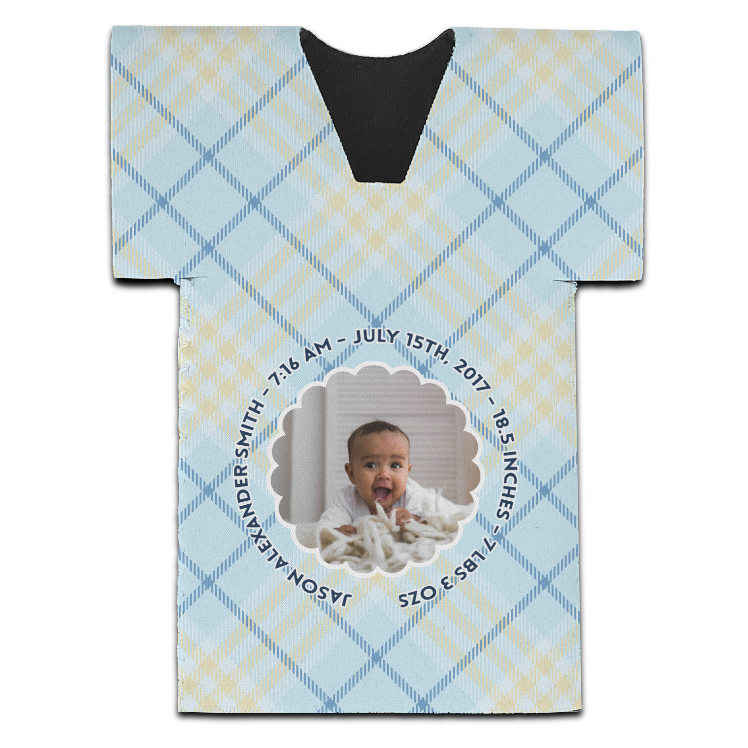 This design is for baby boys. The background is a baby blue plaid. In the middle of the design is a scalloped frame to upload your baby's picture into (make sure it is high quality!). Surrounding the frame is where your personalization goes. Put their name, birthday, or whatever you like.