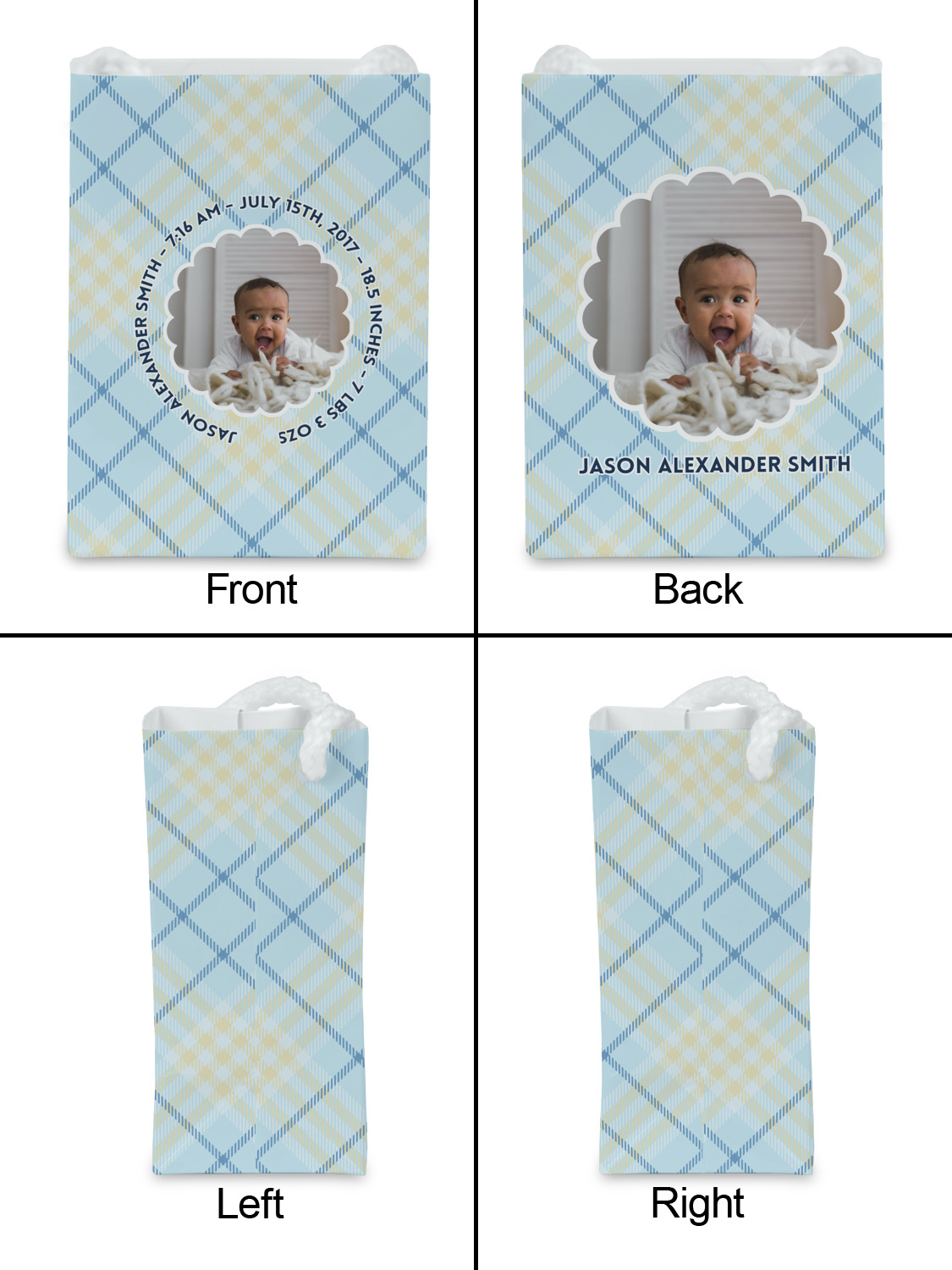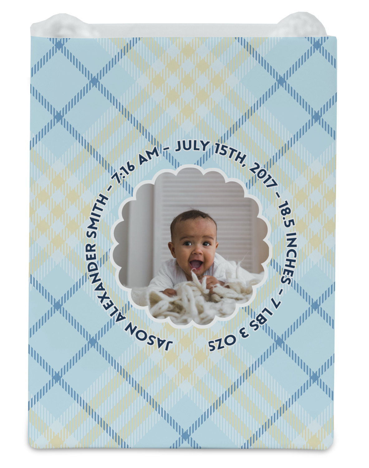 This design is for baby boys. The background is a baby blue plaid. In the middle of the design is a scalloped frame to upload your baby's picture into (make sure it is high quality!). Surrounding the frame is where your personalization goes. Put their name, birthday, or whatever you like.