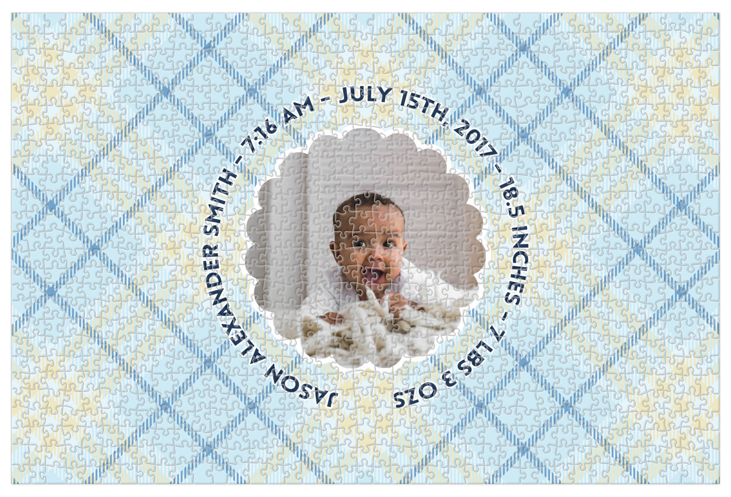 This design is for baby boys. The background is a baby blue plaid. In the middle of the design is a scalloped frame to upload your baby's picture into (make sure it is high quality!). Surrounding the frame is where your personalization goes. Put their name, birthday, or whatever you like.