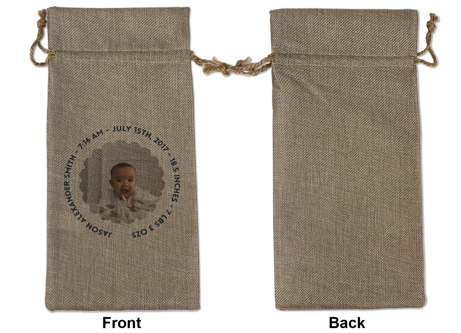 We sell our Burlap Gift Bags in 3 variant sized bags. Made with burlap polyester, each personalized bag can be secured with a twine drawstring pull. Your custom design is available to print on one side or both sides - completely up to you! The sizes of the bags measure approximately 4.5" x 6.5" for the smallest size, 6.5" x 8.0" for the medium size, and 6.5" x 13.5" for the large-sized bag.