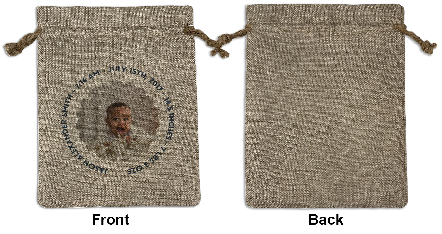 We sell our Burlap Gift Bags in 3 variant sized bags. Made with burlap polyester, each personalized bag can be secured with a twine drawstring pull. Your custom design is available to print on one side or both sides - completely up to you! The sizes of the bags measure approximately 4.5" x 6.5" for the smallest size, 6.5" x 8.0" for the medium size, and 6.5" x 13.5" for the large-sized bag.
