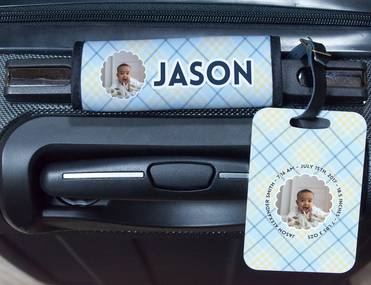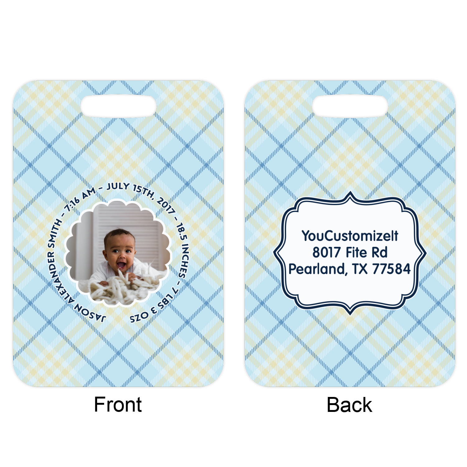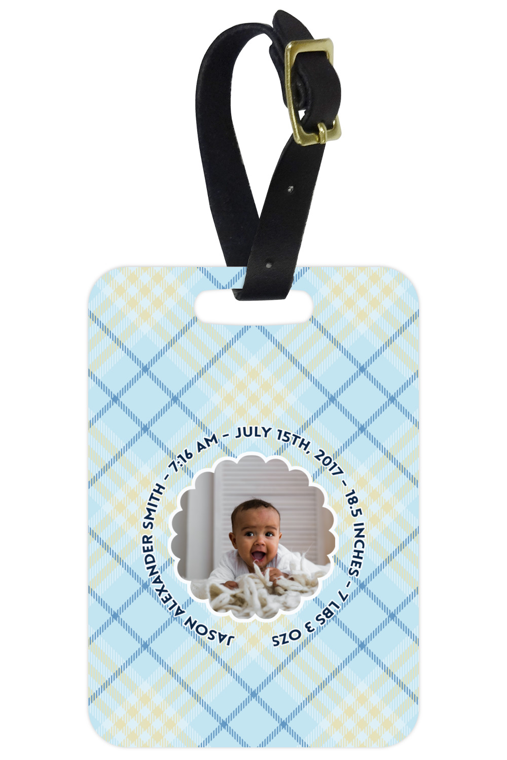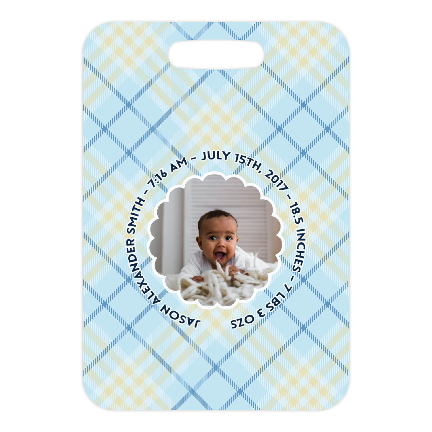 This design is for baby boys. The background is a baby blue plaid. In the middle of the design is a scalloped frame to upload your baby's picture into (make sure it is high quality!). Surrounding the frame is where your personalization goes. Put their name, birthday, or whatever you like.