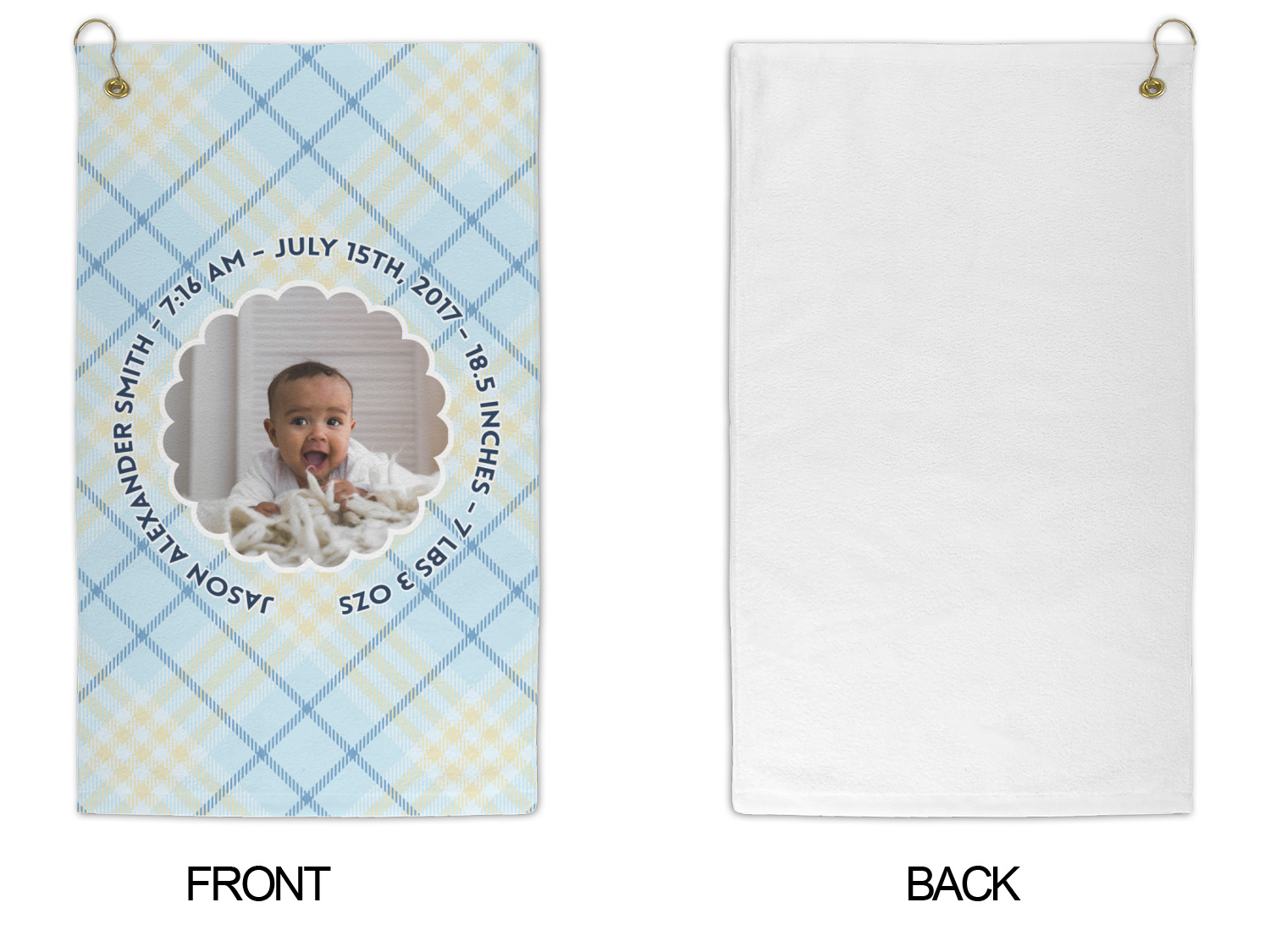 This design is for baby boys. The background is a baby blue plaid. In the middle of the design is a scalloped frame to upload your baby's picture into (make sure it is high quality!). Surrounding the frame is where your personalization goes. Put their name, birthday, or whatever you like.