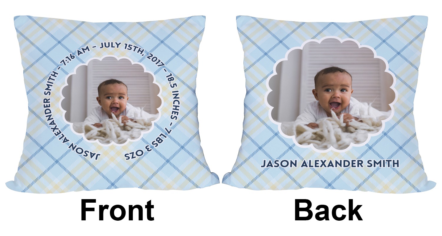 This design is for baby boys. The background is a baby blue plaid. In the middle of the design is a scalloped frame to upload your baby's picture into (make sure it is high quality!). Surrounding the frame is where your personalization goes. Put their name, birthday, or whatever you like.