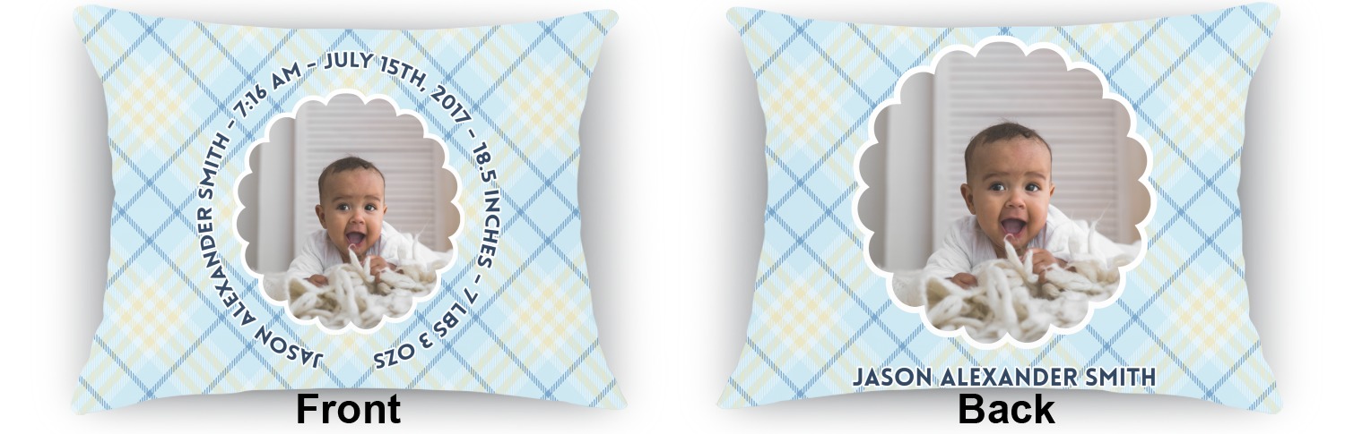 This design is for baby boys. The background is a baby blue plaid. In the middle of the design is a scalloped frame to upload your baby's picture into (make sure it is high quality!). Surrounding the frame is where your personalization goes. Put their name, birthday, or whatever you like.