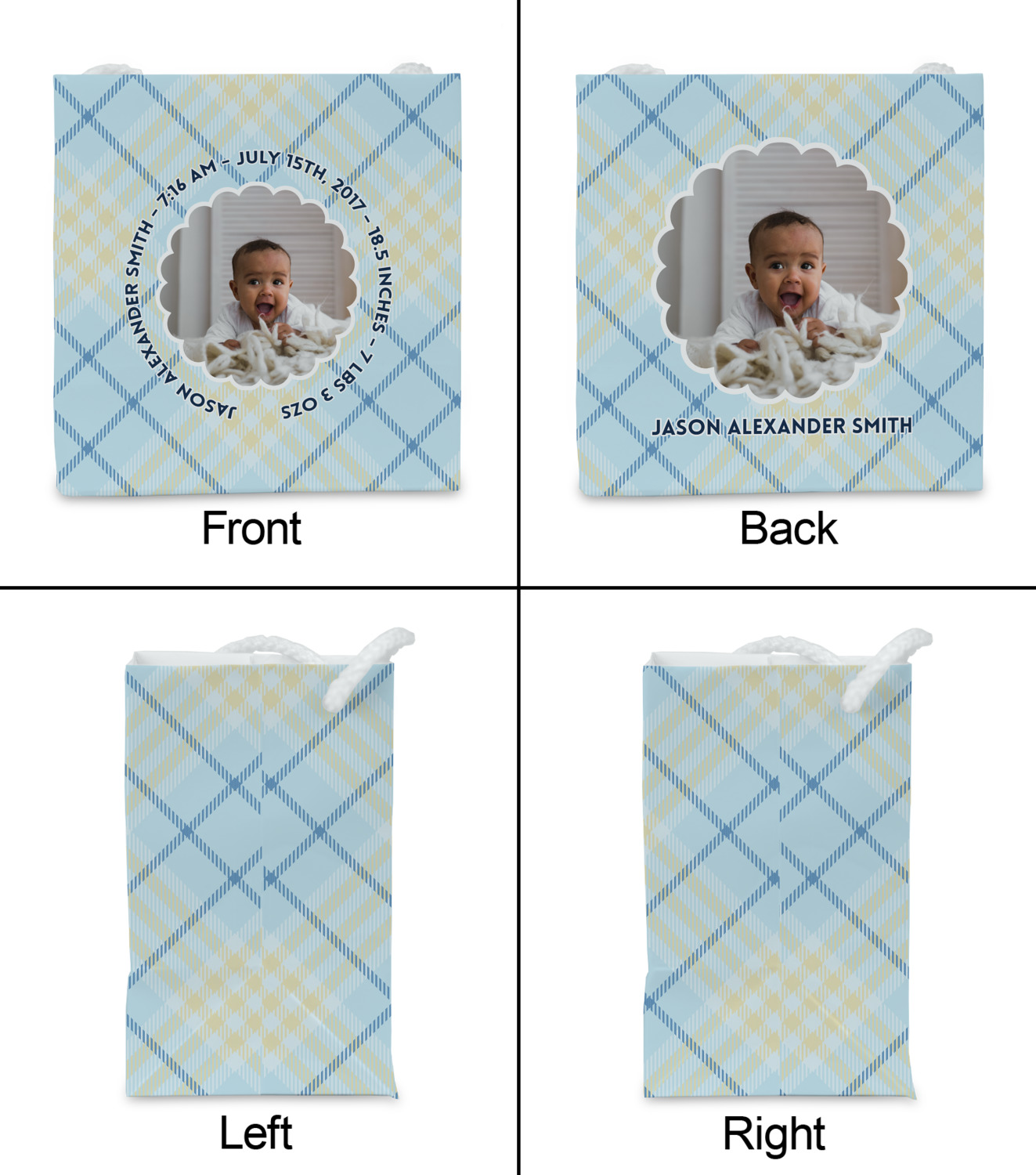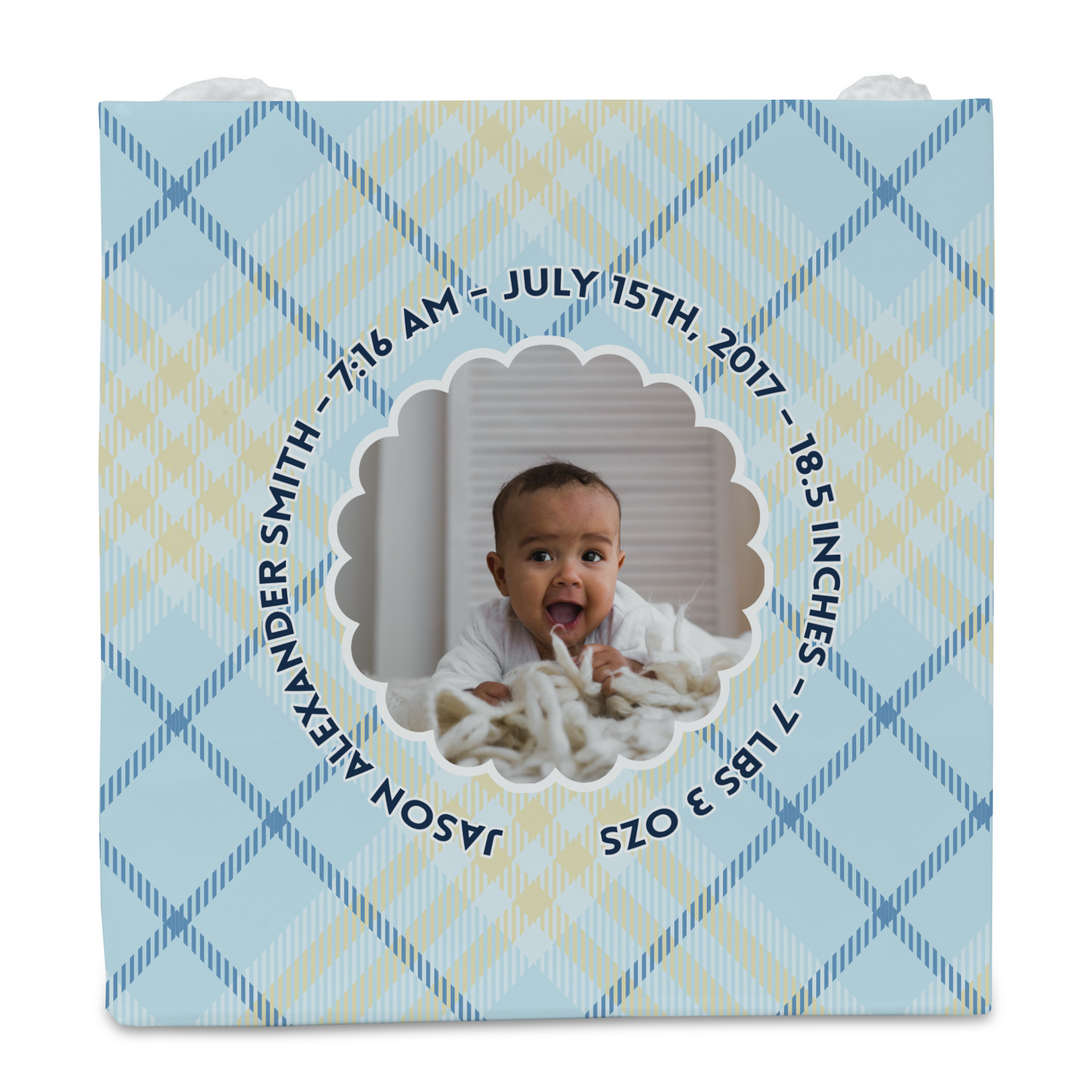 This design is for baby boys. The background is a baby blue plaid. In the middle of the design is a scalloped frame to upload your baby's picture into (make sure it is high quality!). Surrounding the frame is where your personalization goes. Put their name, birthday, or whatever you like.
