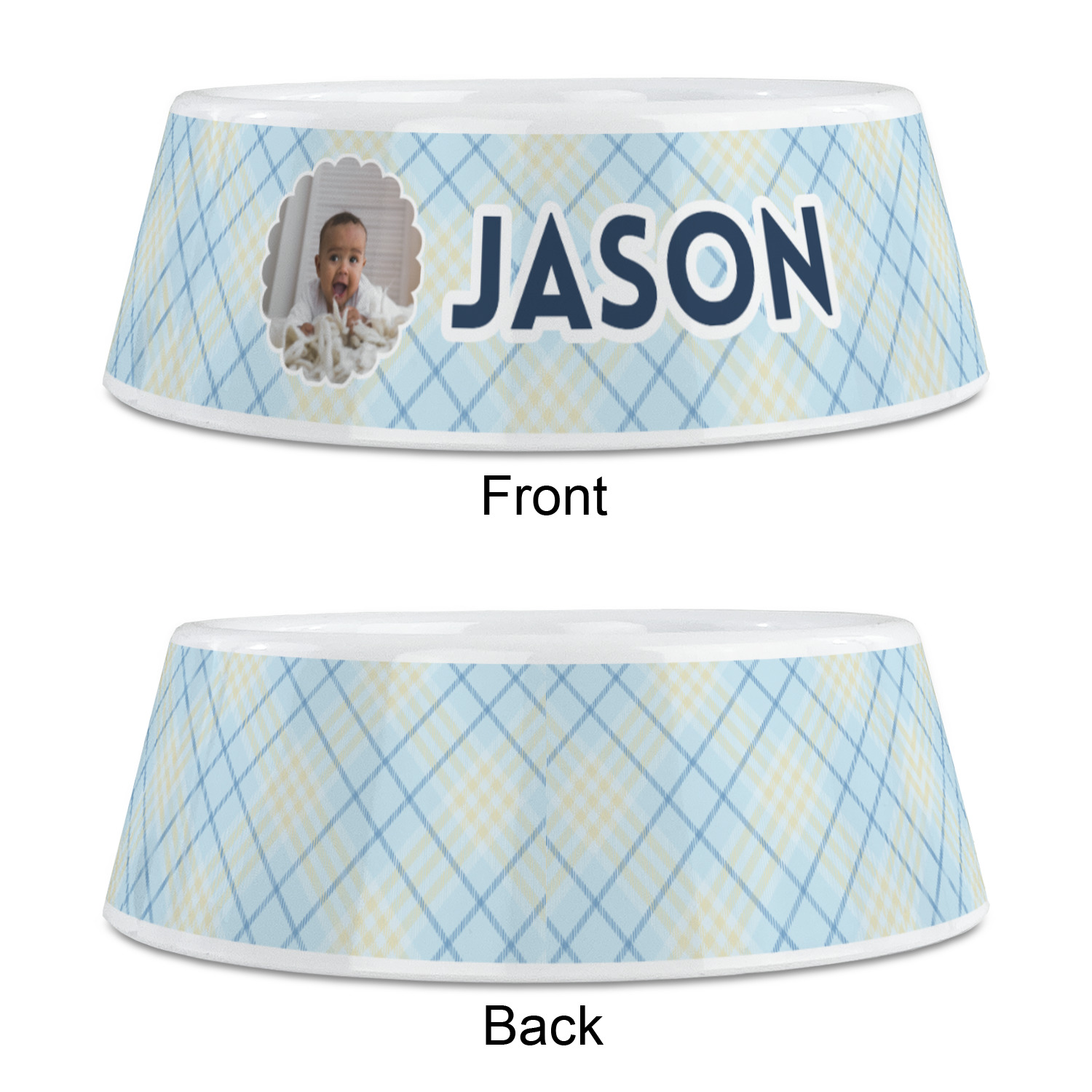 This design is for baby boys. The background is a baby blue plaid. In the middle of the design is a scalloped frame to upload your baby's picture into (make sure it is high quality!). Surrounding the frame is where your personalization goes. Put their name, birthday, or whatever you like.