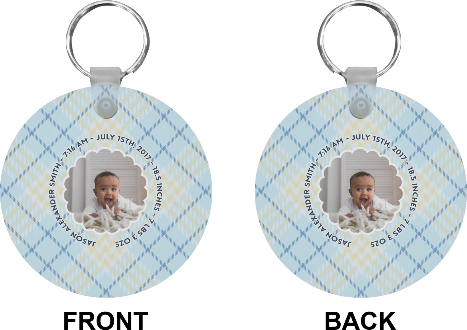 Our personalized keychains attach to the included metal, split key ring with a plastic, removable snap. Since a metal ring is included with your purchase, you have the liberty to keep your keys together on the ring, with or without your unique keychain. We offer this keychain in three different shapes: circle, heart, or diamond. We print your personalized design(s) on both sides of the key chain, and the surface has a glossy, reflective finish that only emphasizes your design. Each keychain is approximately 2.25 by 2.25 inches.