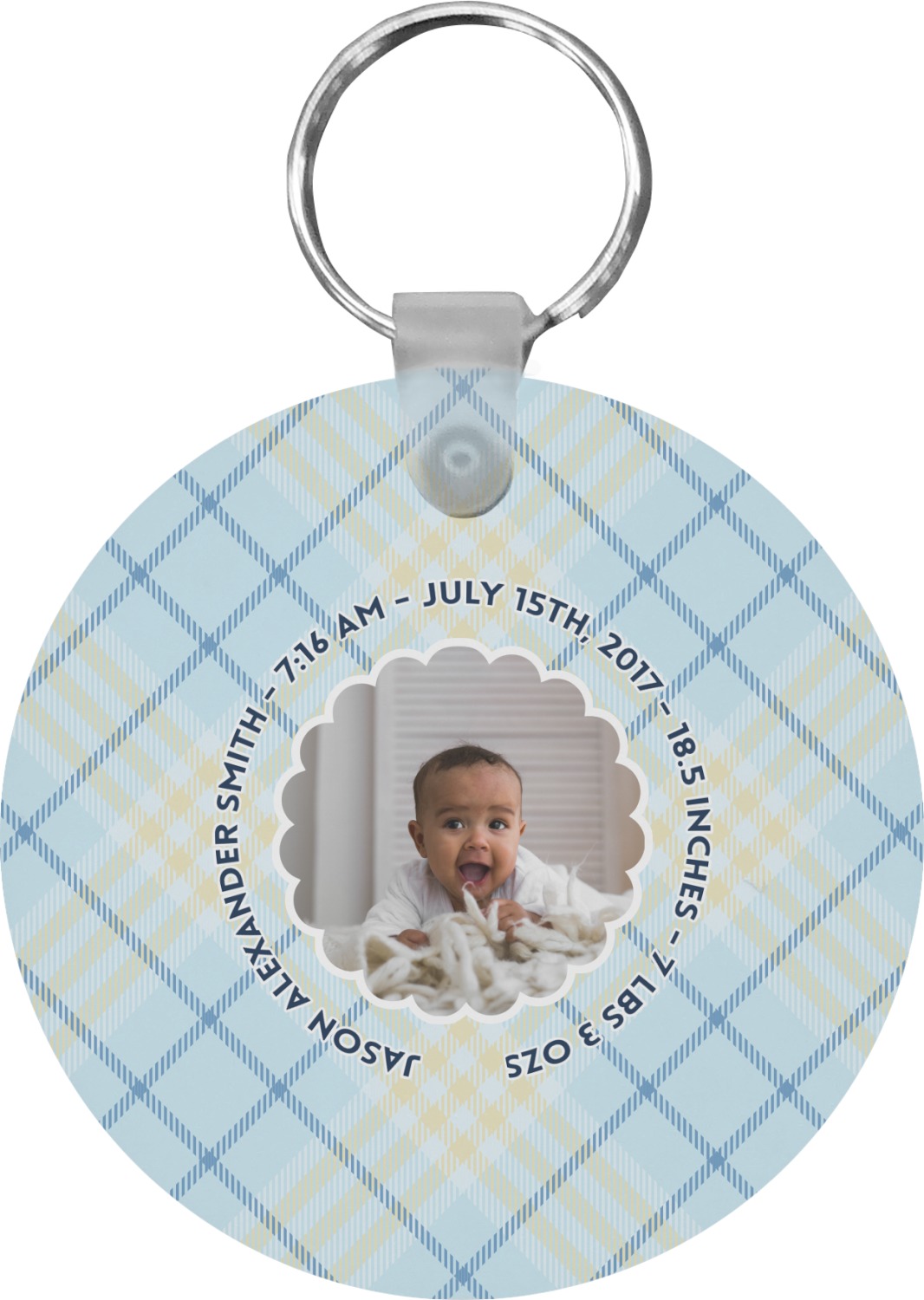 This design is for baby boys. The background is a baby blue plaid. In the middle of the design is a scalloped frame to upload your baby's picture into (make sure it is high quality!). Surrounding the frame is where your personalization goes. Put their name, birthday, or whatever you like.