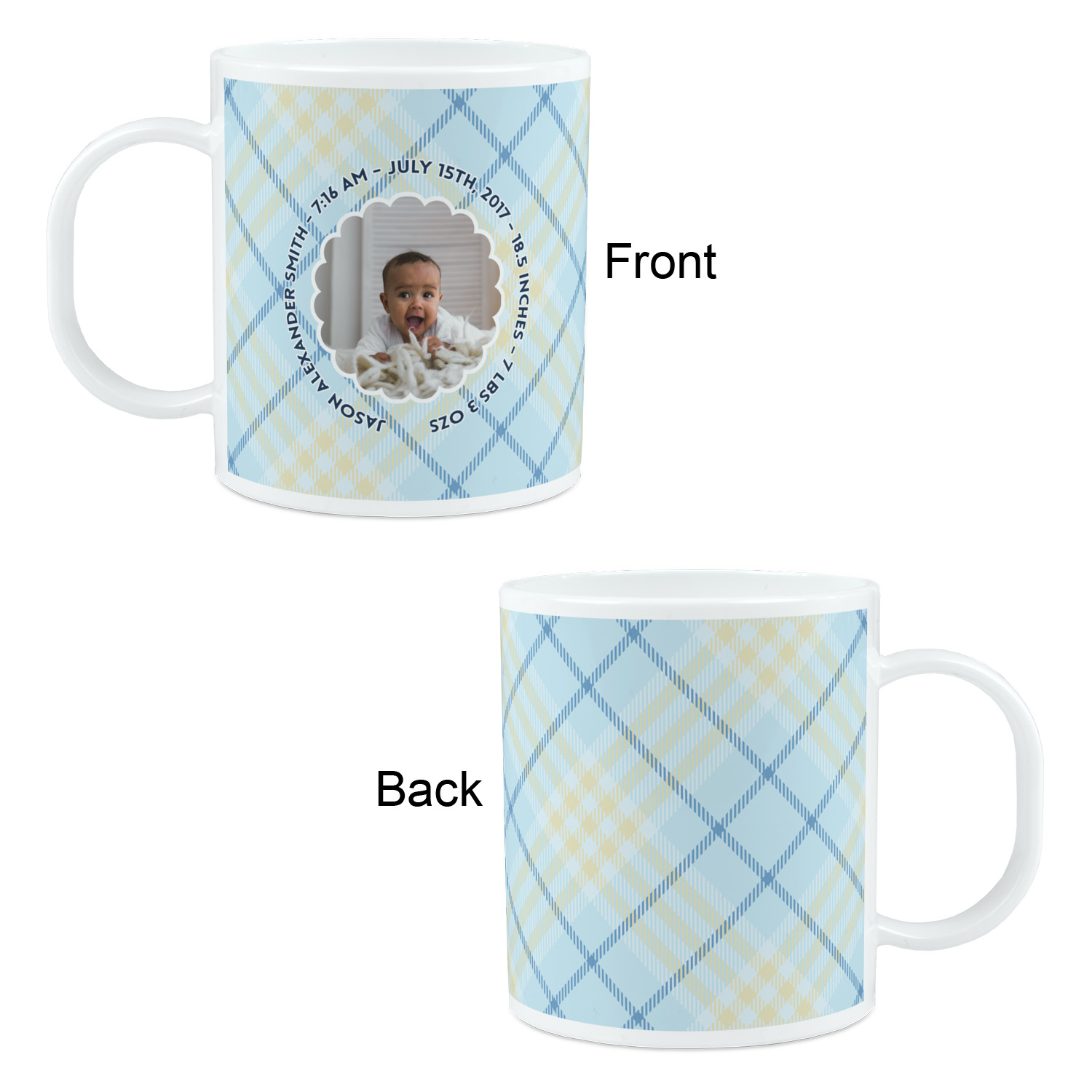 This design is for baby boys. The background is a baby blue plaid. In the middle of the design is a scalloped frame to upload your baby's picture into (make sure it is high quality!). Surrounding the frame is where your personalization goes. Put their name, birthday, or whatever you like.
