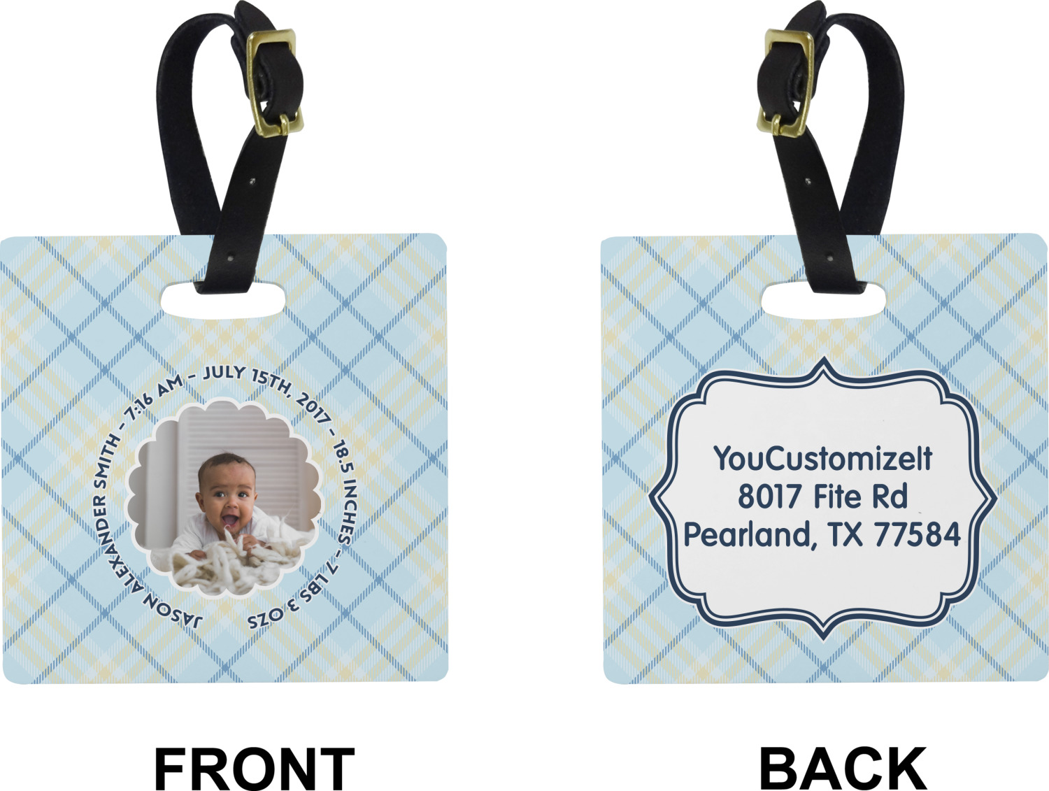 These cute luggage tags are made of a fiber-reinforced, UV-resistant plastic, making them waterproof and durable enough for both everyday use and the rugged adventures of any traveler! A leather strap with holes and a buckle is included with your purchase and can be used to attach your custom luggage tag to any suitcase, backpack, or duffel bag. You can design these travel tags as you wish; your customization will be displayed across the front, while the back will show as little or as much personal information as you want.