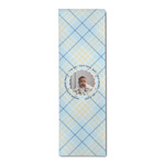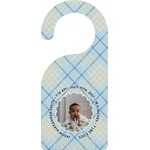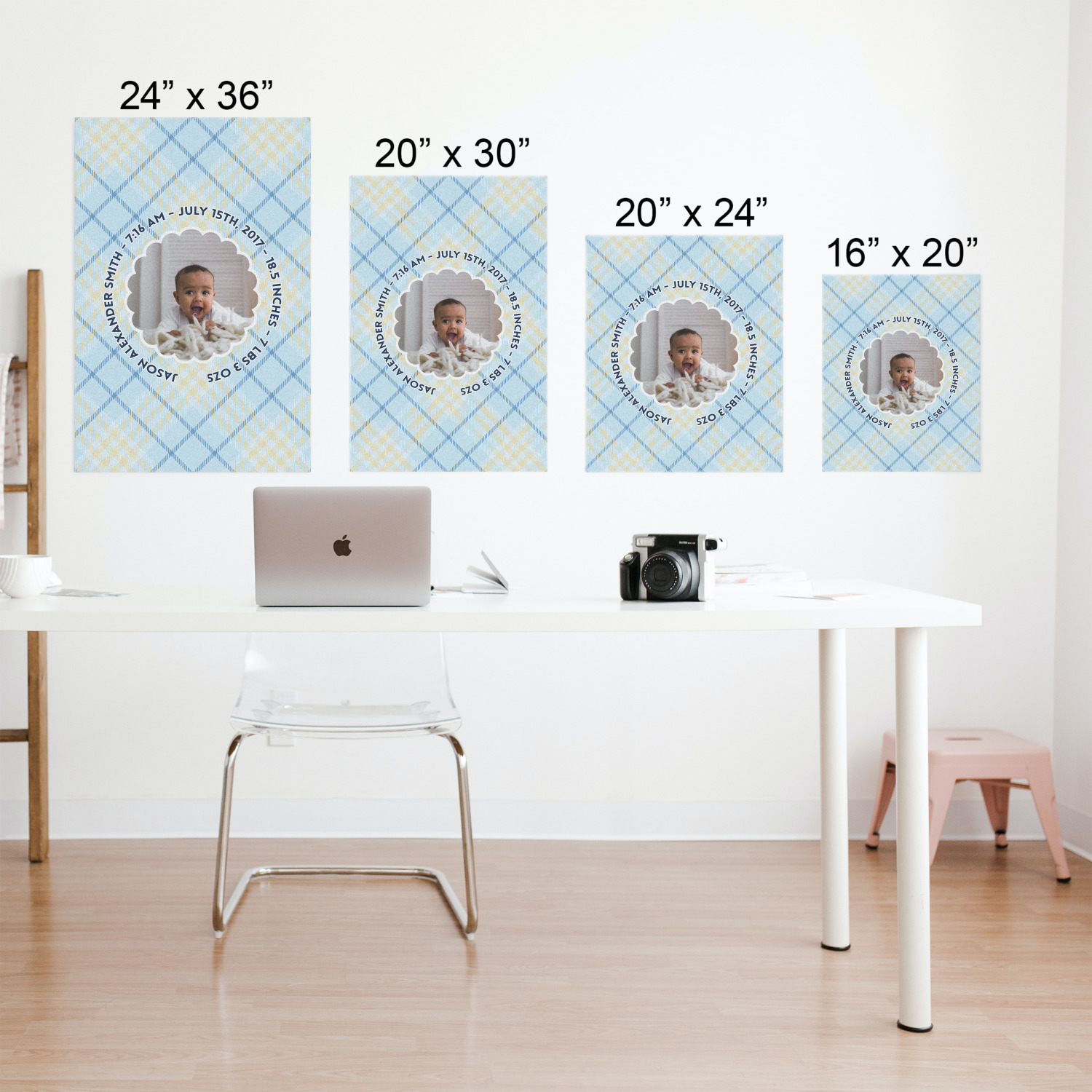 This design is for baby boys. The background is a baby blue plaid. In the middle of the design is a scalloped frame to upload your baby's picture into (make sure it is high quality!). Surrounding the frame is where your personalization goes. Put their name, birthday, or whatever you like.