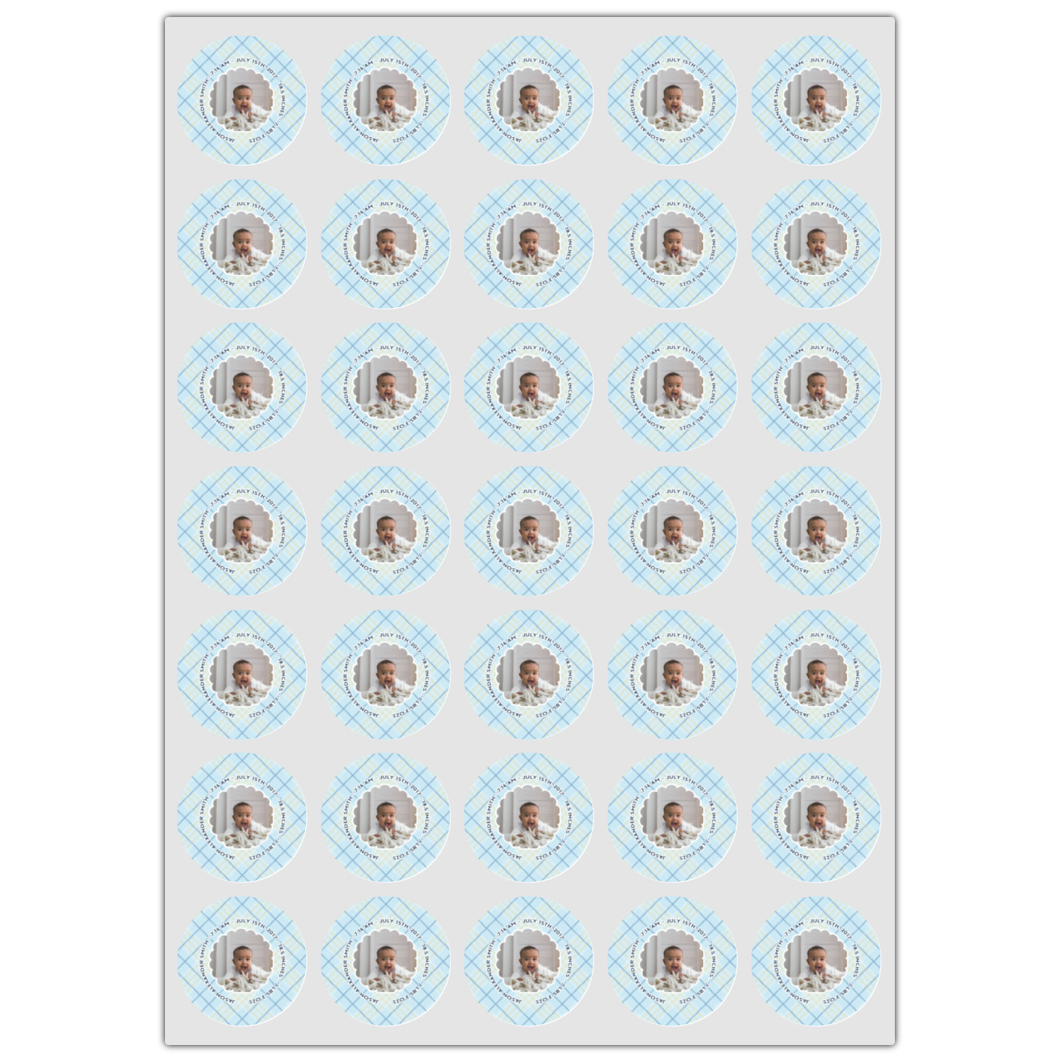 This design is for baby boys. The background is a baby blue plaid. In the middle of the design is a scalloped frame to upload your baby's picture into (make sure it is high quality!). Surrounding the frame is where your personalization goes. Put their name, birthday, or whatever you like.