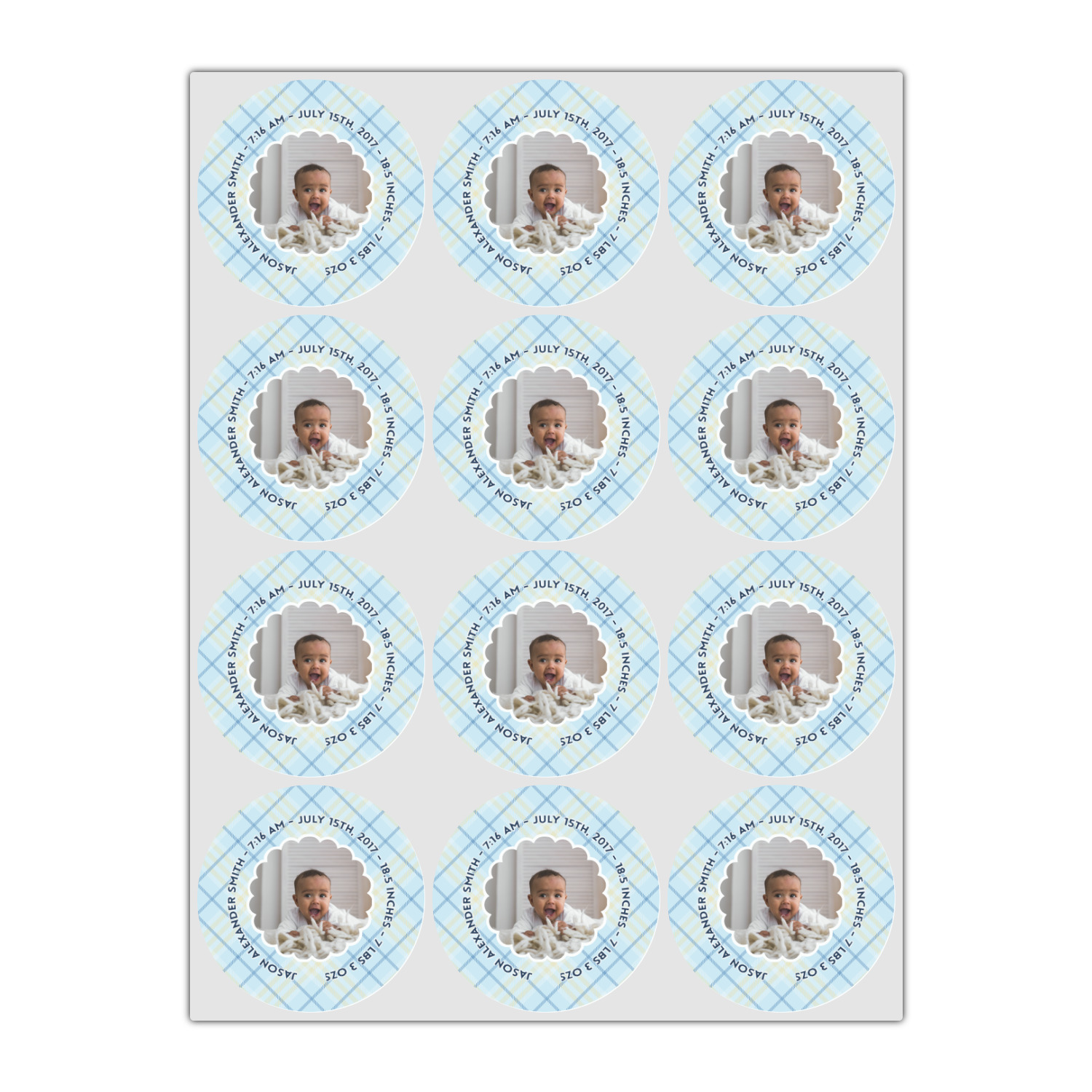 This design is for baby boys. The background is a baby blue plaid. In the middle of the design is a scalloped frame to upload your baby's picture into (make sure it is high quality!). Surrounding the frame is where your personalization goes. Put their name, birthday, or whatever you like.
