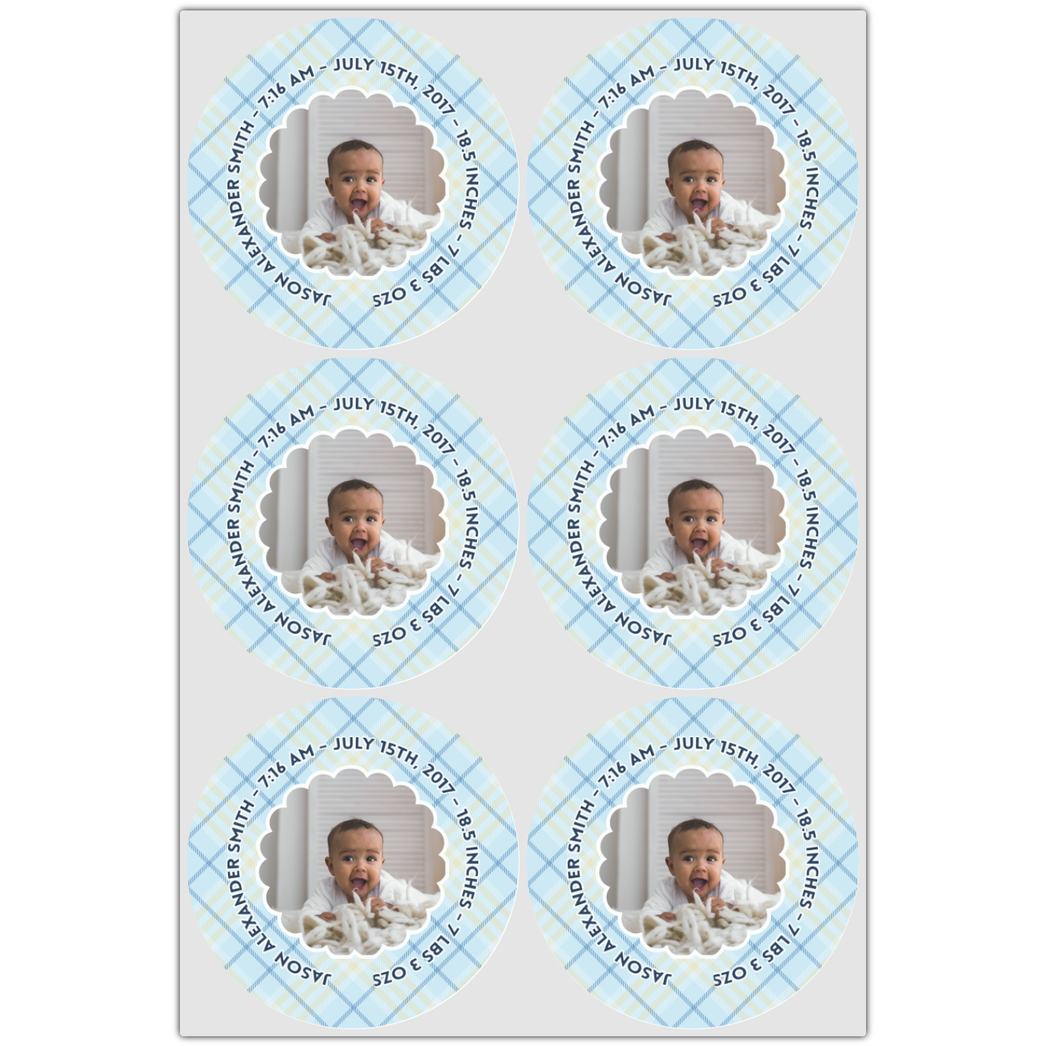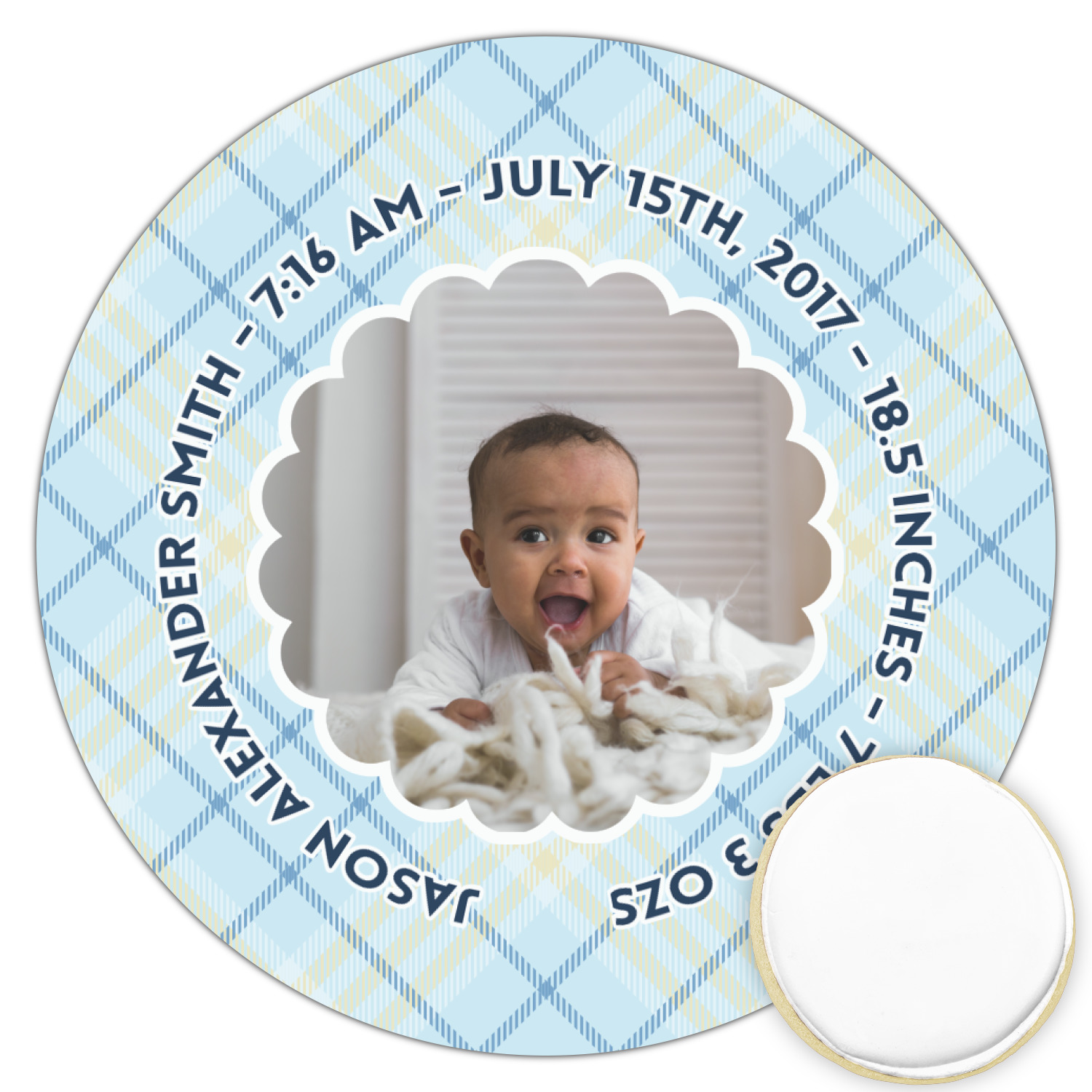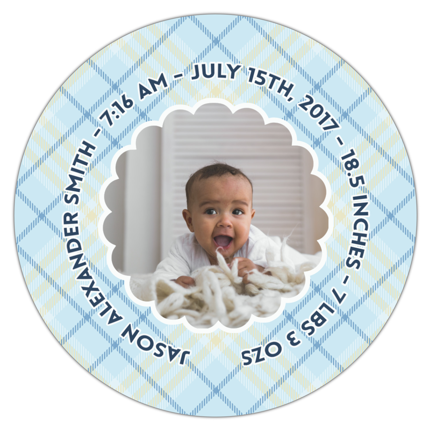 This design is for baby boys. The background is a baby blue plaid. In the middle of the design is a scalloped frame to upload your baby's picture into (make sure it is high quality!). Surrounding the frame is where your personalization goes. Put their name, birthday, or whatever you like.