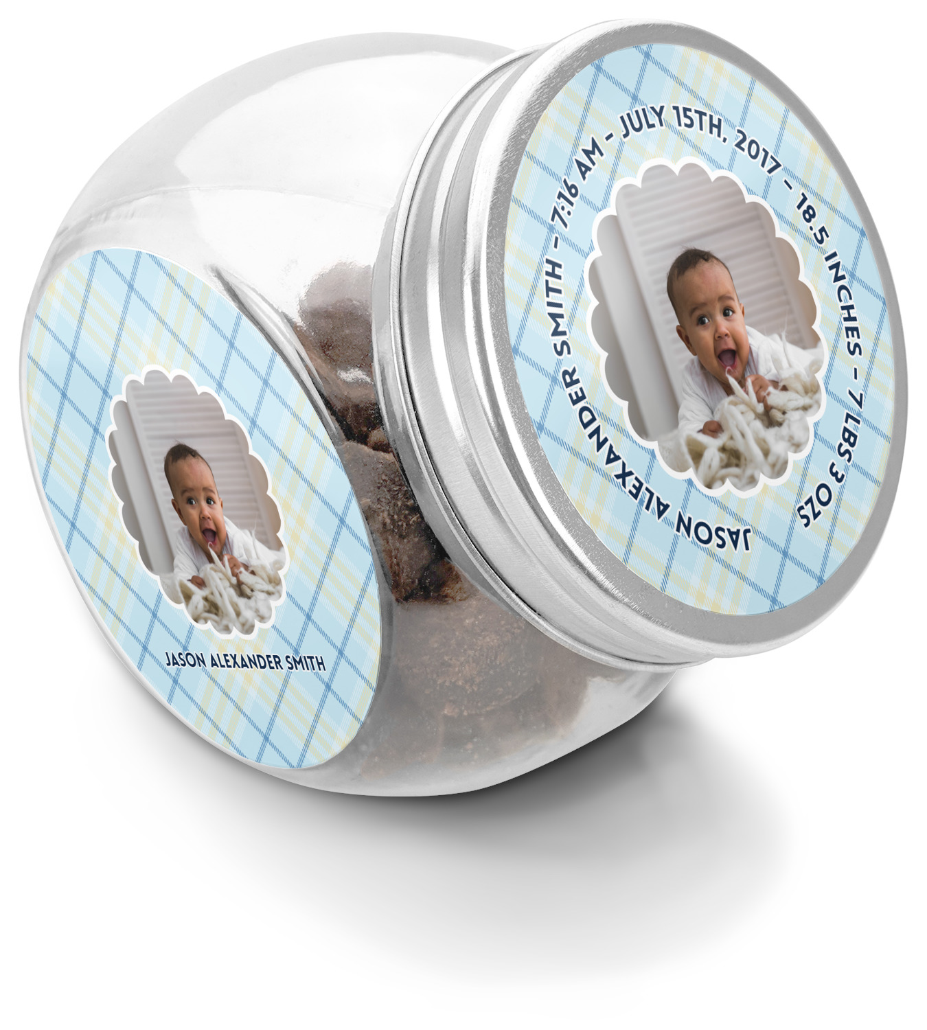 This design is for baby boys. The background is a baby blue plaid. In the middle of the design is a scalloped frame to upload your baby's picture into (make sure it is high quality!). Surrounding the frame is where your personalization goes. Put their name, birthday, or whatever you like.