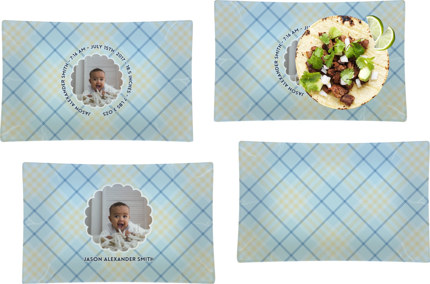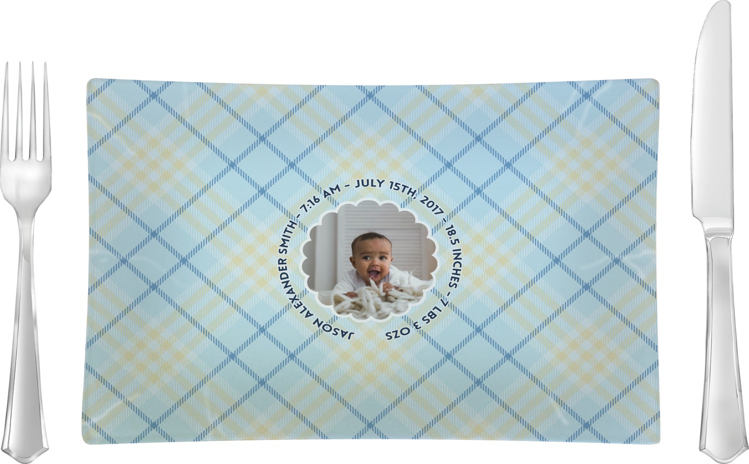 This design is for baby boys. The background is a baby blue plaid. In the middle of the design is a scalloped frame to upload your baby's picture into (make sure it is high quality!). Surrounding the frame is where your personalization goes. Put their name, birthday, or whatever you like.