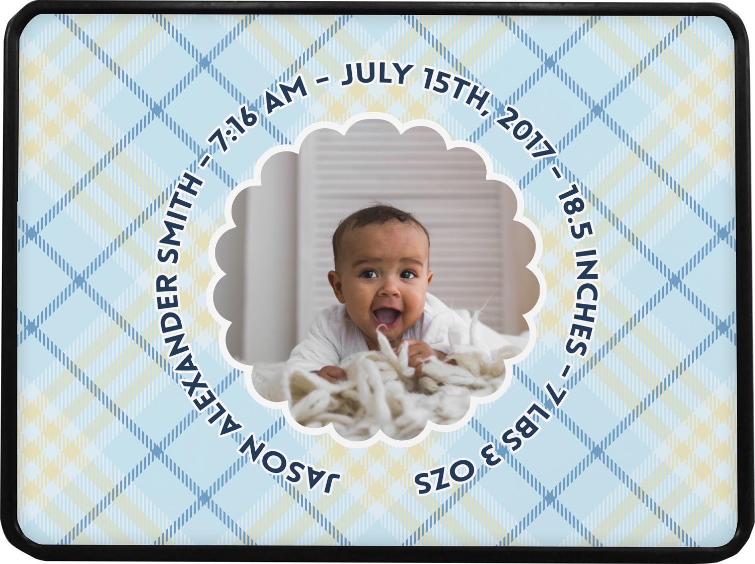 This design is for baby boys. The background is a baby blue plaid. In the middle of the design is a scalloped frame to upload your baby's picture into (make sure it is high quality!). Surrounding the frame is where your personalization goes. Put their name, birthday, or whatever you like.