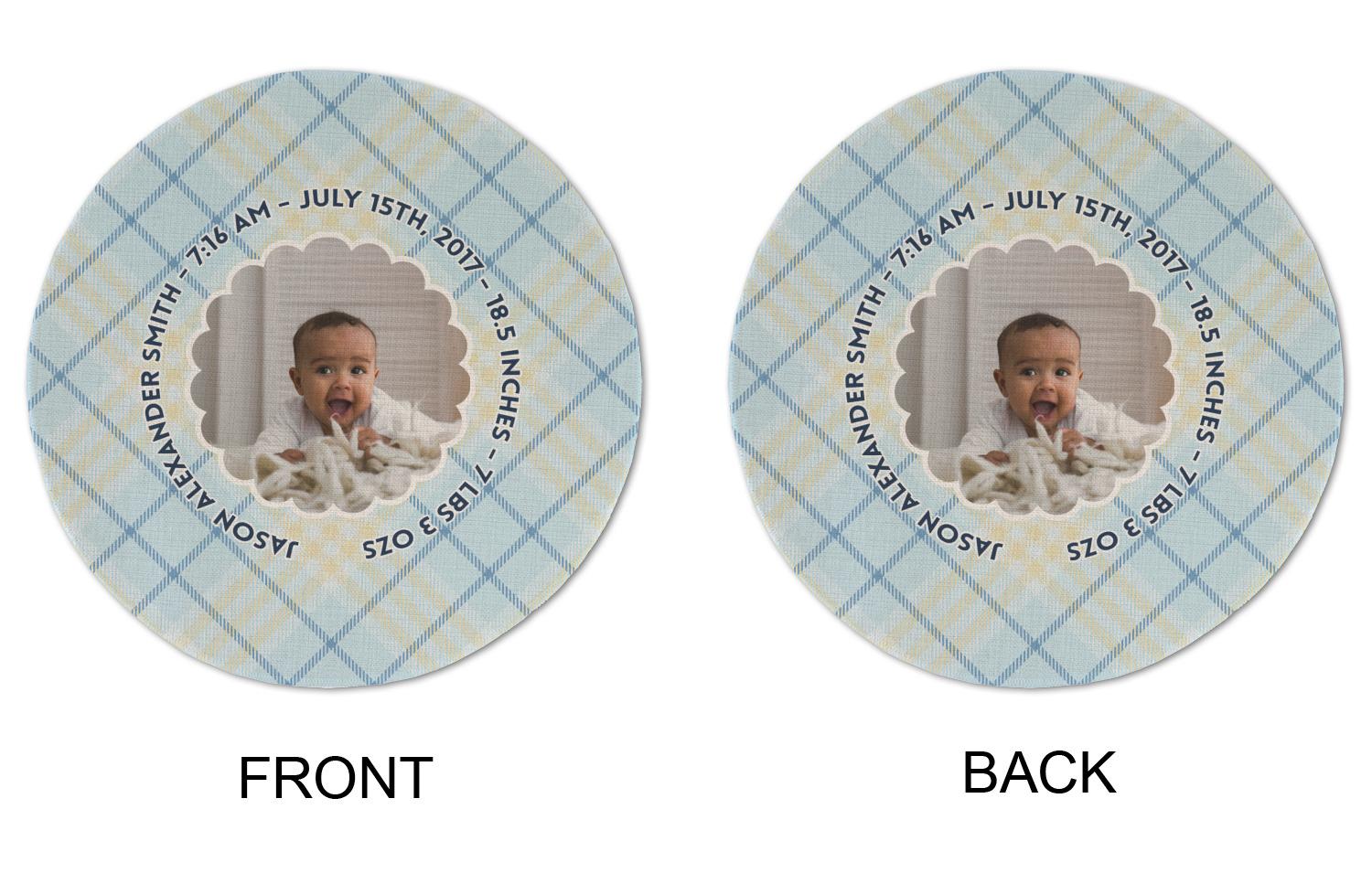 This design is for baby boys. The background is a baby blue plaid. In the middle of the design is a scalloped frame to upload your baby's picture into (make sure it is high quality!). Surrounding the frame is where your personalization goes. Put their name, birthday, or whatever you like.