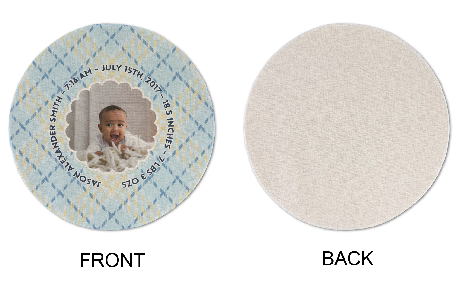 This design is for baby boys. The background is a baby blue plaid. In the middle of the design is a scalloped frame to upload your baby's picture into (make sure it is high quality!). Surrounding the frame is where your personalization goes. Put their name, birthday, or whatever you like.