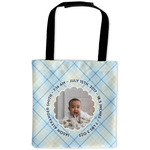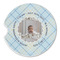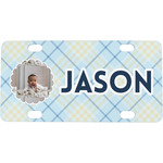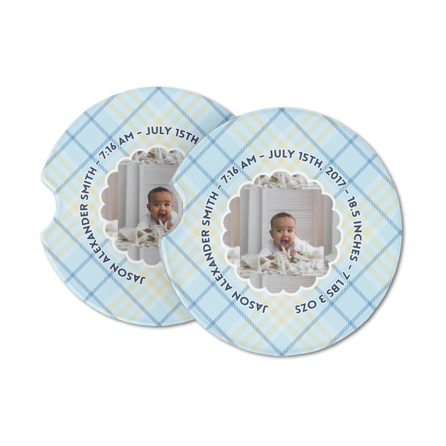 This design is for baby boys. The background is a baby blue plaid. In the middle of the design is a scalloped frame to upload your baby's picture into (make sure it is high quality!). Surrounding the frame is where your personalization goes. Put their name, birthday, or whatever you like.